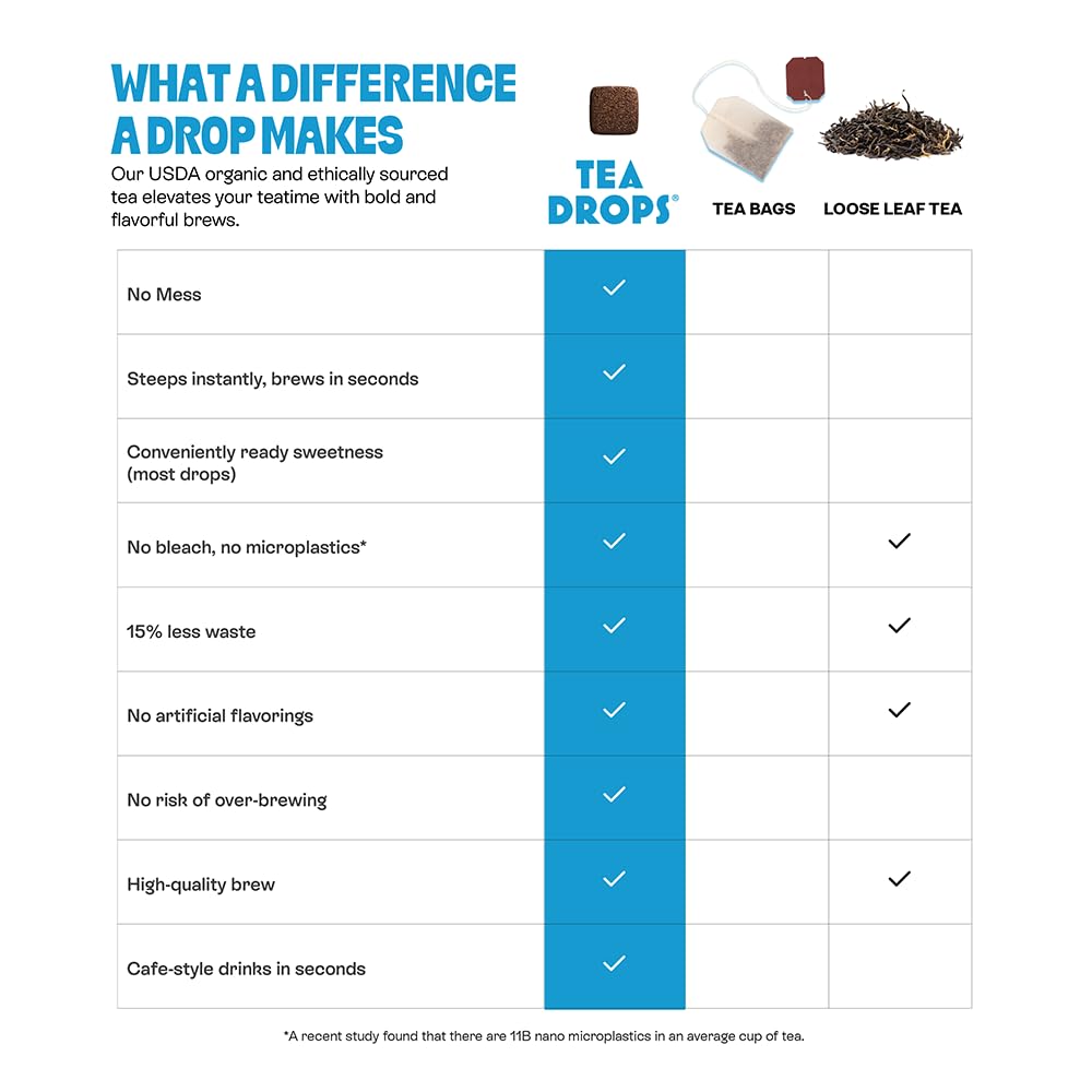 - MADE FROM THE HEART: Tea Drops is a women-owned brand created by women who love tea and the shared experiences it ignites. Savor moments shared with friends and family over a health-conscious cup of tea knowing that with every purchase, clean water is making its way to those in need through our partnership with Thirst Project.