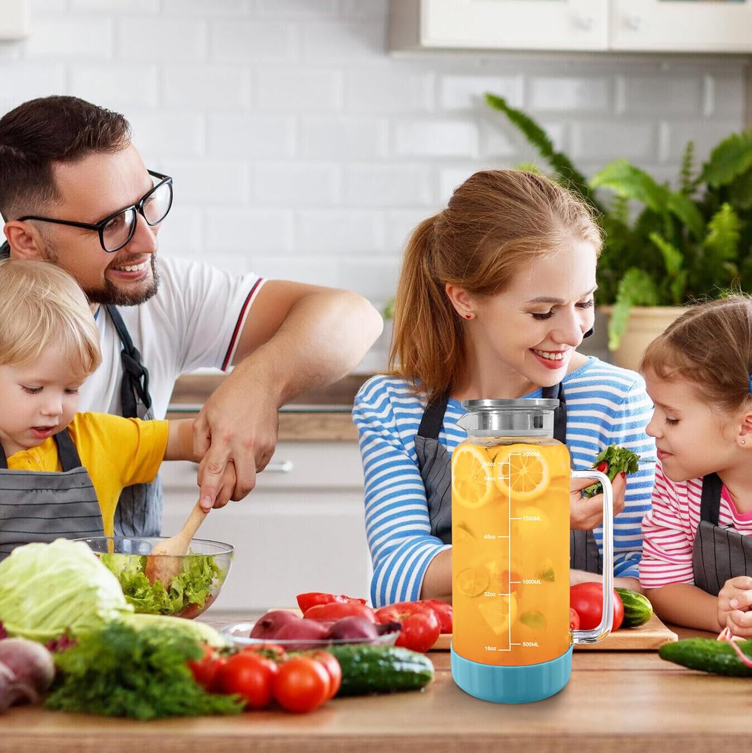 Aofmee 68oz Glass Pitcher with Lid, 2 Liter Water Carafe with Silicone Base and Precise Scale Line, Ice Tea Pitcher for Fridge, Anti-Slip Glass Jug for Sun Tea Juice Coffee Milk Beverage (Blue)