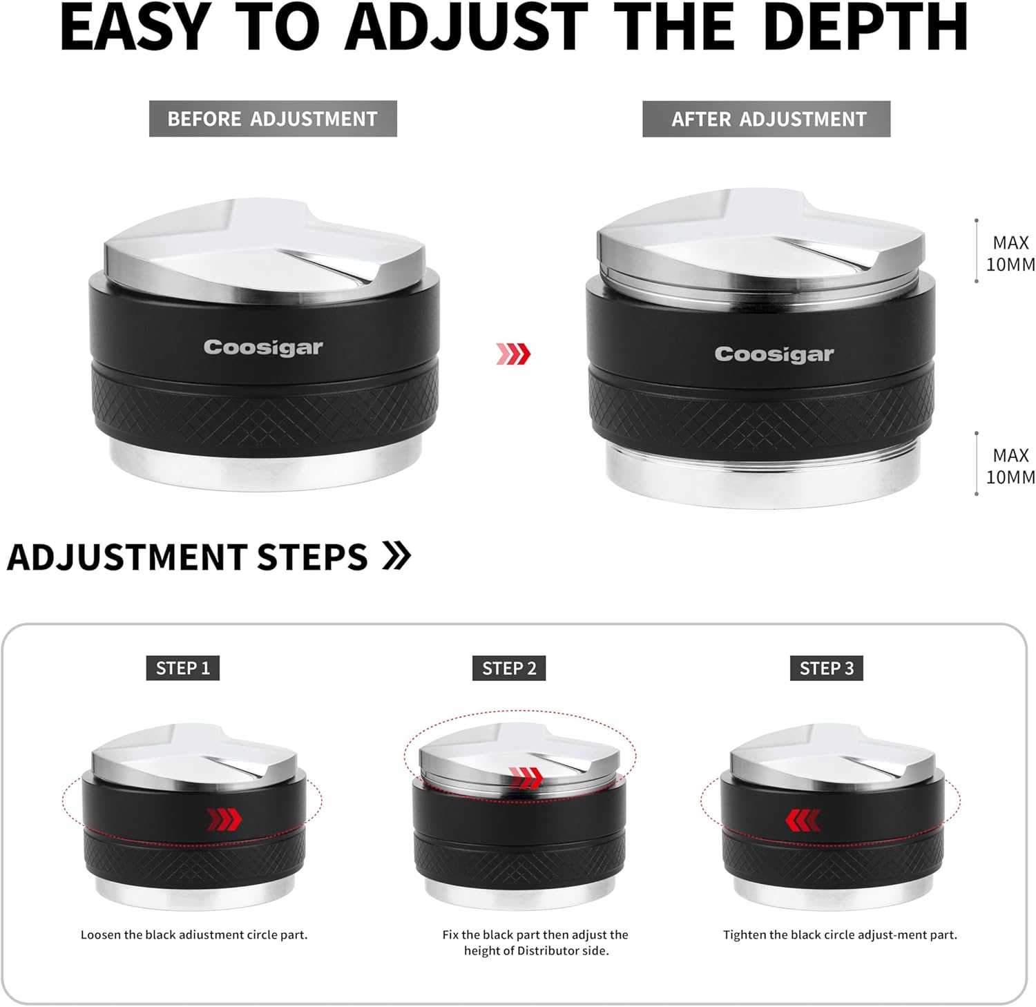 - ใ๐ ๐จ๐จ๐-๐๐ซ๐๐๐ ๐๐ญ๐๐ข๐ง๐ฅ๐๐ฌ๐ฌ ๐๐ญ๐๐๐ฅใCoosigar coffee distributor/tamper base is made of 100% food-grade stainless steel, ensuring safety,health, and easy cleaning. We adhere to the design philosophy of quality, functionality, and user experience, with the handle crafted from stylish and durable high quality aluminum alloy. It conforms to ergonomics, providing you with a stable and comfortable gripping experience and an excellent tactile sensation.