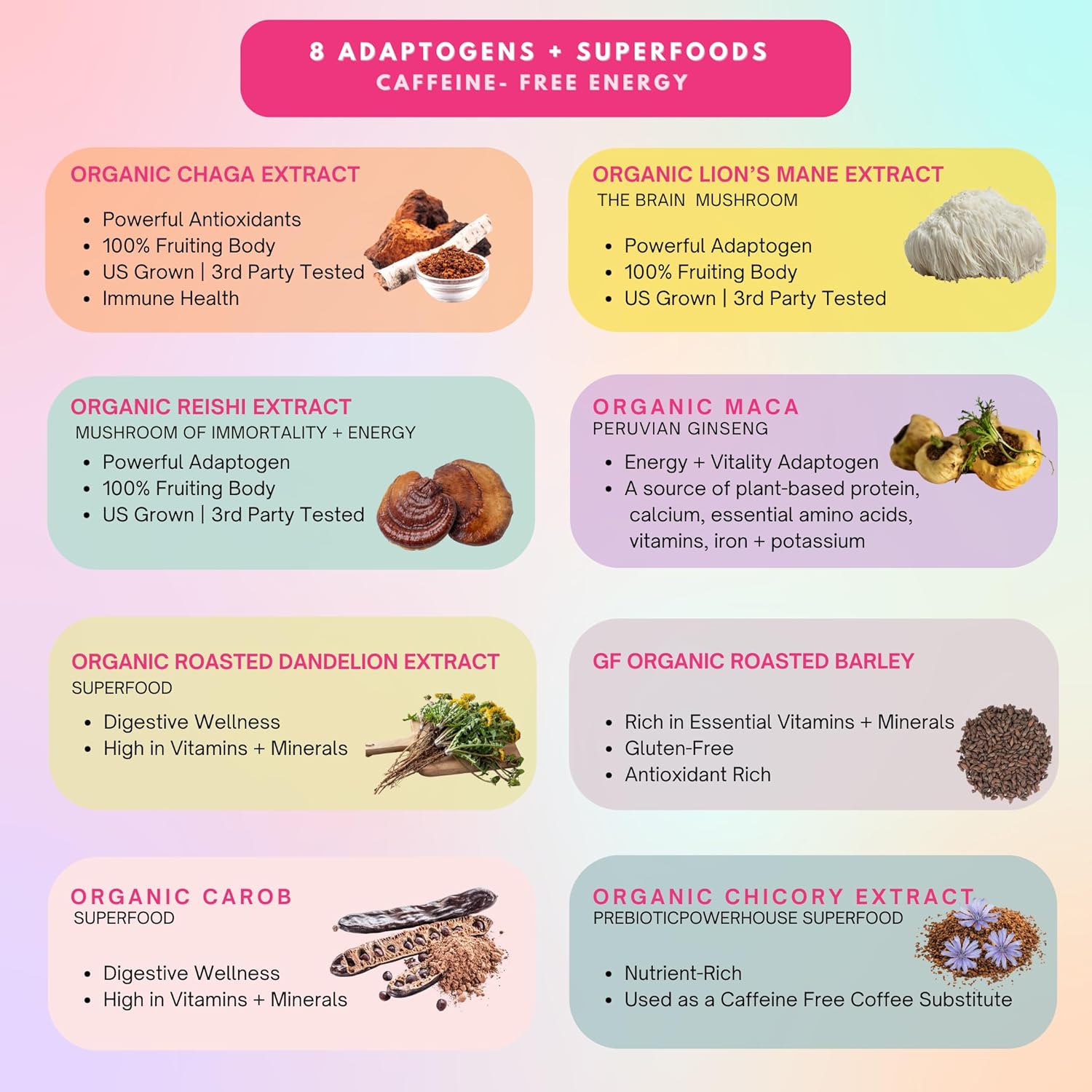 - Healthy Coffee: Our mushroom blend powder contains 7 adaptogens + superfoods. This combination makes an amazing coffee superfood mushroom mix for coffee add-ins for an earlybird morning cocktail.