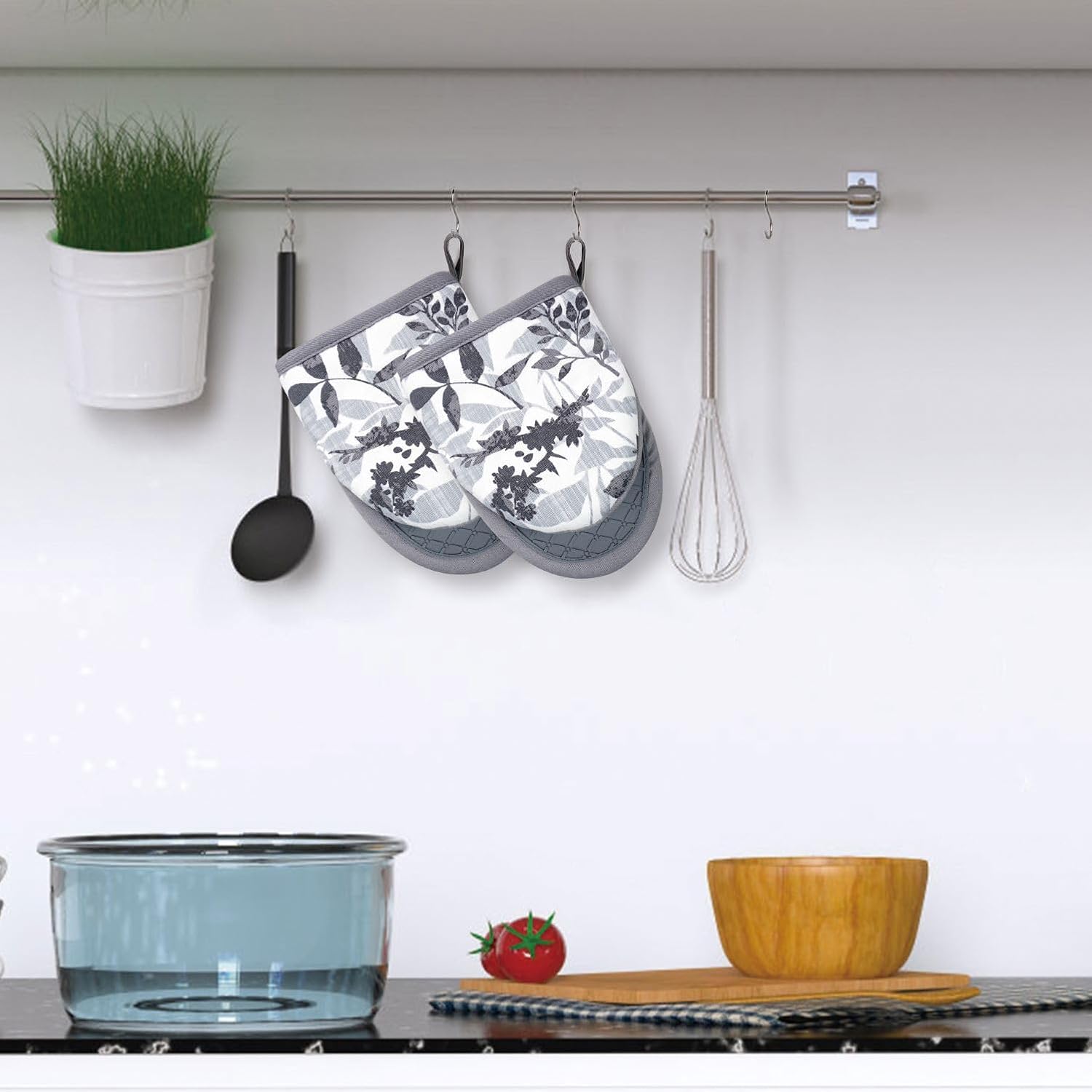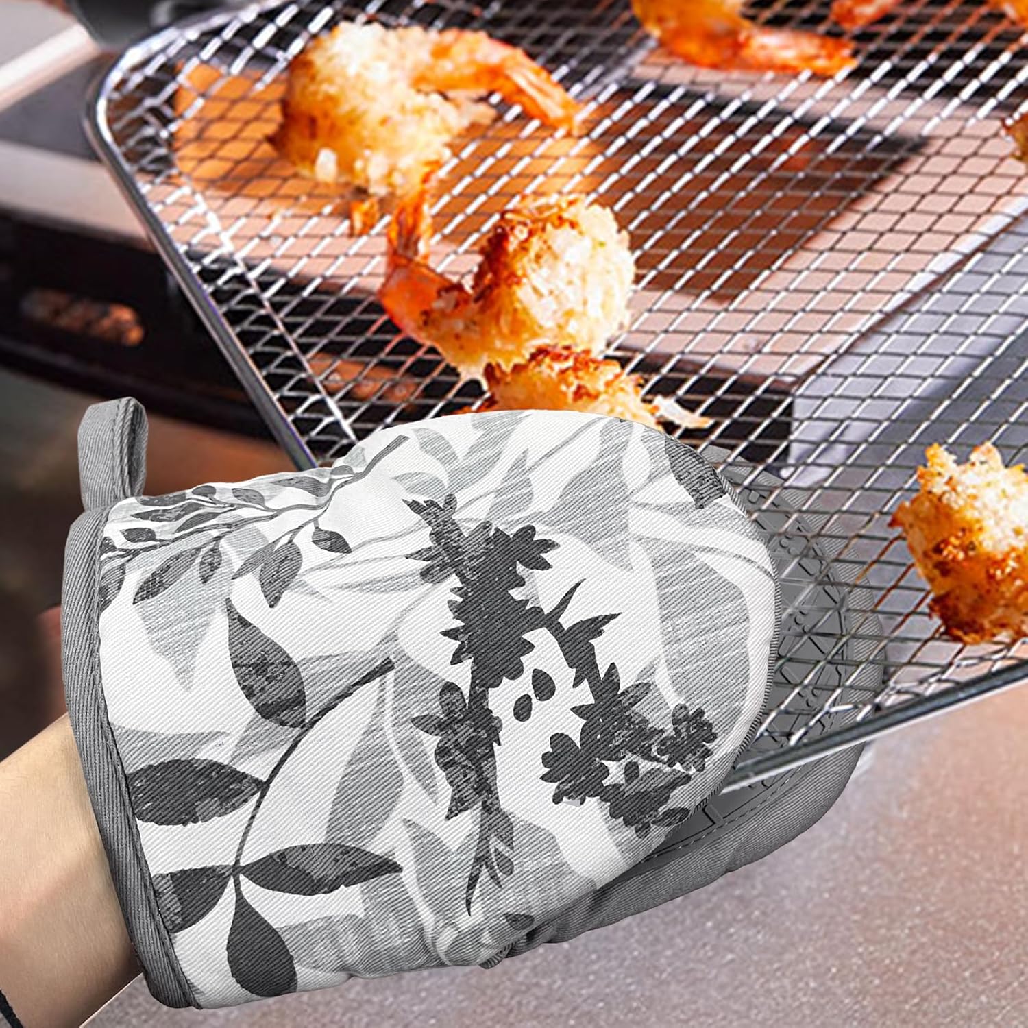 - 3. CUTE & FUNCTIONAL: The oven mitts with fashion patten is cute and add some fun to our kitchen decor. hanging loop, features a convenient for displaying or storing, save your room and make your kitchen look more cleaner.