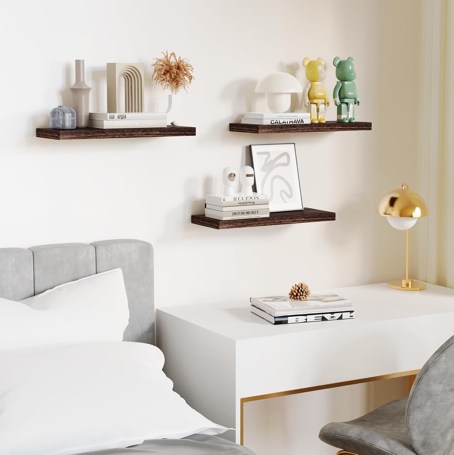- 【Modern Concise Design】Our white floating shelves are designed with modern simplicity. It has streamlined look to bring modern style and vintage atmosphere to the home. Our wood floating shelves for wall is a set of 3 wall mounted shelves. Our rustic wood shelves can give us plenty of space for creativity, we can choose a line, a ladder shape, or a symmetric way. Let our floating shelf wood more suitable to the home decor and bring a better visual experience.
