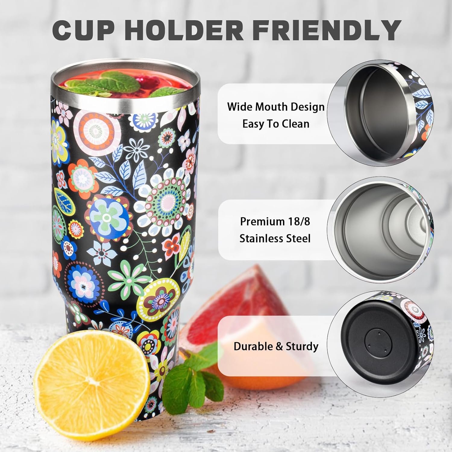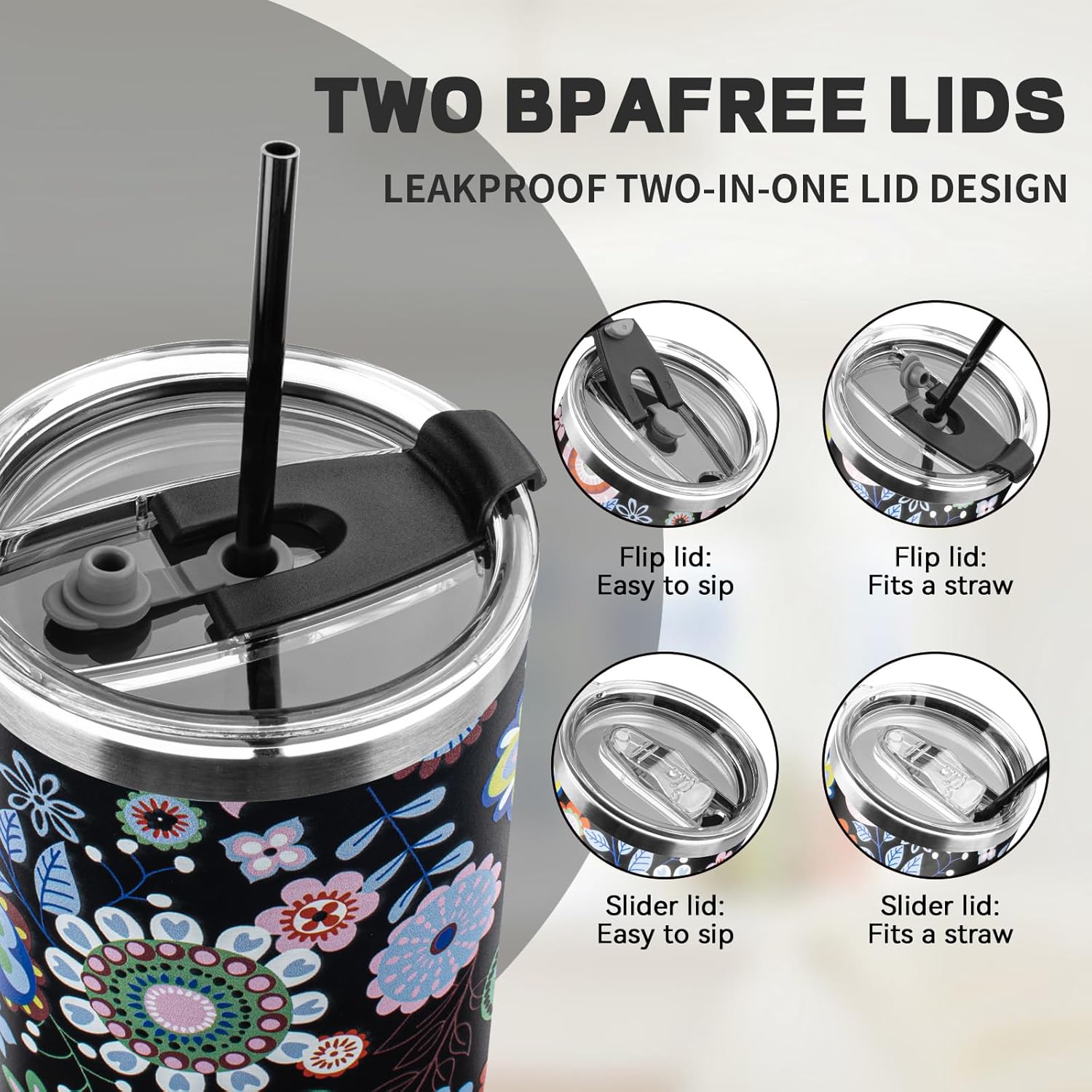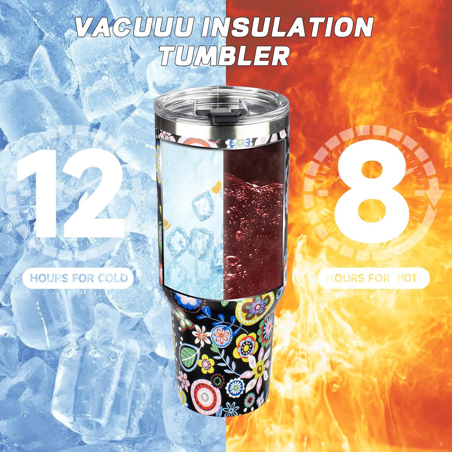 40 oz Tumbler with Lids and Straws, Stainless Steel Insulated Coffee Tumbler, Double Wall Vacuum Insulated Travel Mug Cup, Leakproof Thermal Coffee Cup for Hot and Cold Drinks (Flower)