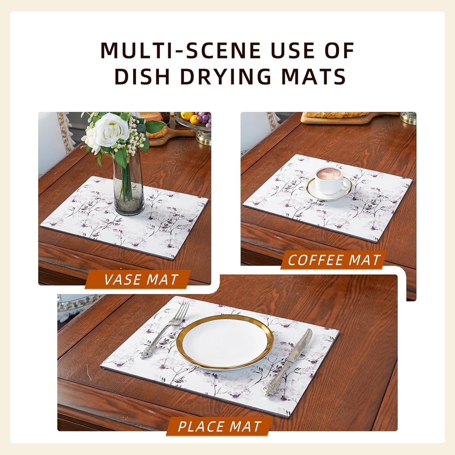 Dish Drying Mat, Diatomaceous Earth Soft Coffee Mat, Absorbent Silicone Dish Drying Mat for Kitchen Counter or Sink for Kitchen Bathroom Coffee Bar (Inked Flower, 12 x 16 Inches)