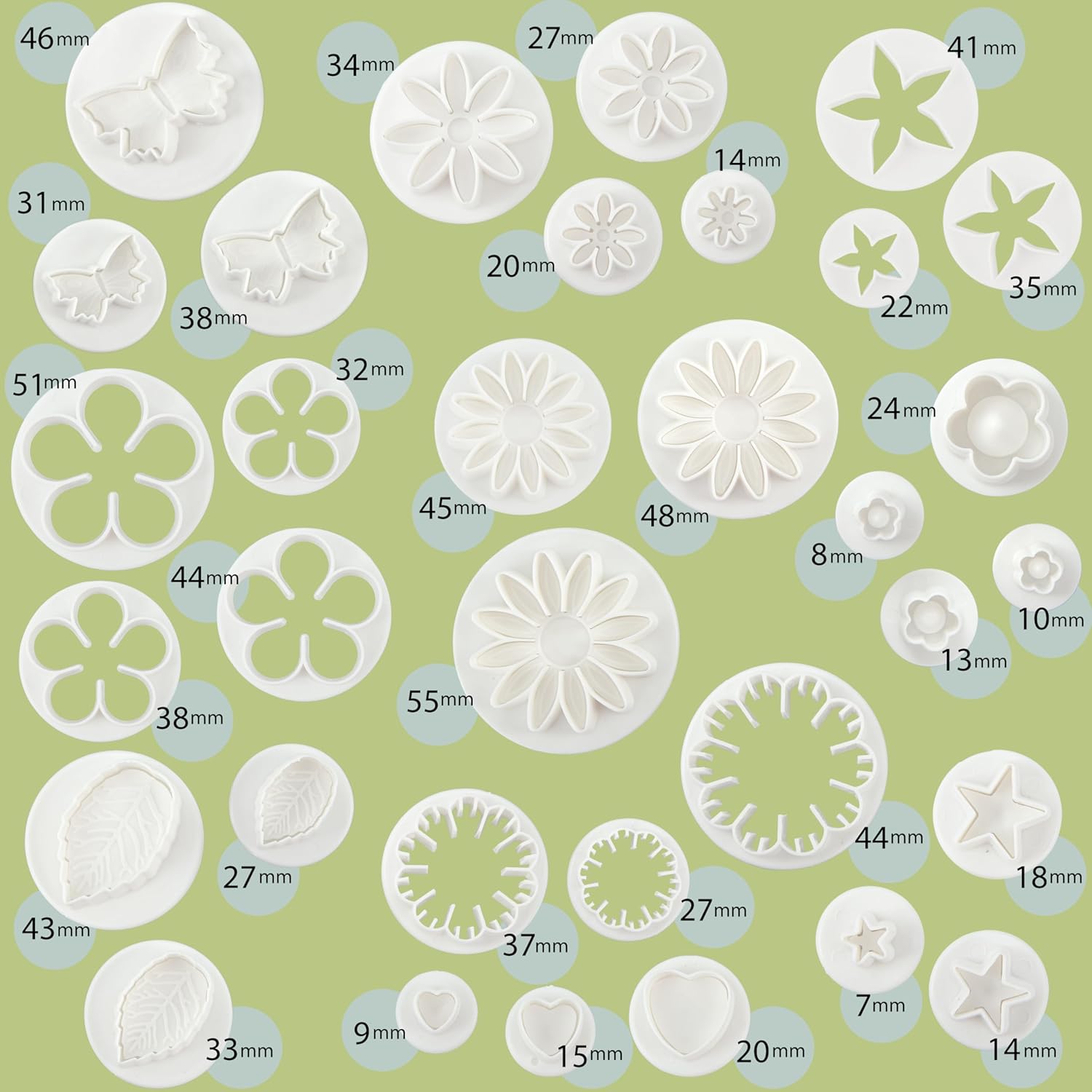 - Premium quality - Made of ABS and polypropylene, these tools are sturdy, durable, and not easy to bend or break. The smooth edges ensure easy release of the gume paste and fondant. Includes flowers, butterflies, star and heart fondant cutters and plunger cutters.