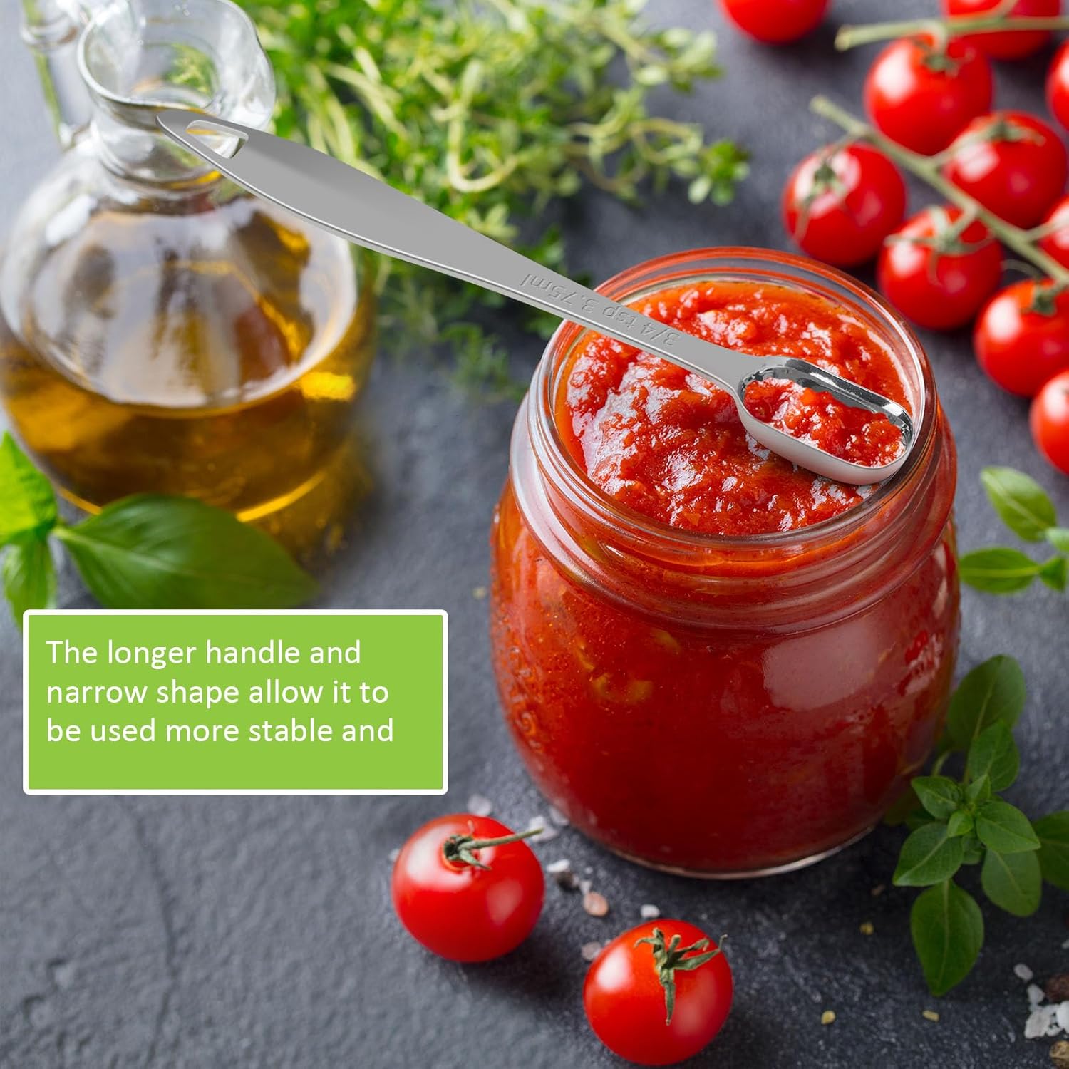 - 【High Quality】Unlike ordinary measuring spoons, the durability measuring spoon is 100% made from food-grade 304 stainless steel with rectangular & narrow design to ensure that the spices will not be spilled. The longer handle and narrow shape allow it to be used more stable and efficient with all deep or shallow spice jars, bottles, and containers.