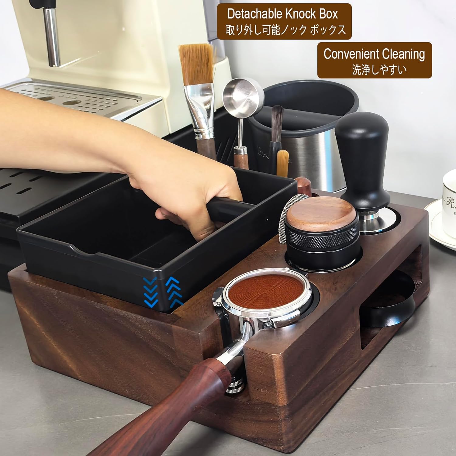 Espresso tamping station and knock box,Wooden portafilter holder,Espresso organizer station box,Tamping station fit for storage 51/54/58mm coffee accessories,Multifunctional espresso station