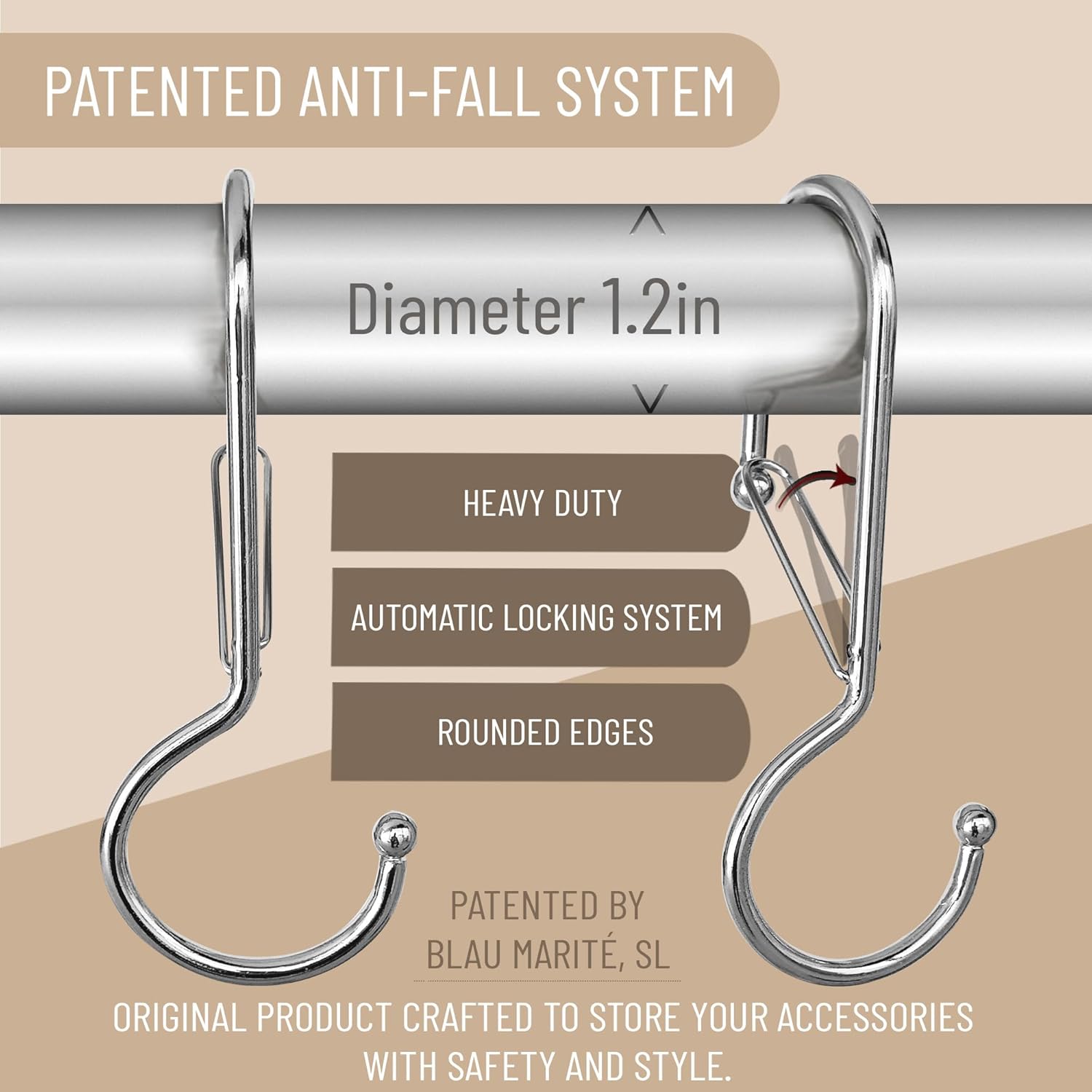 - PATENTED IN THE UNITED STATES: These hooks are equipped with a lock that prevents them from falling from the bar when hanging or taking off utensils or clothes.