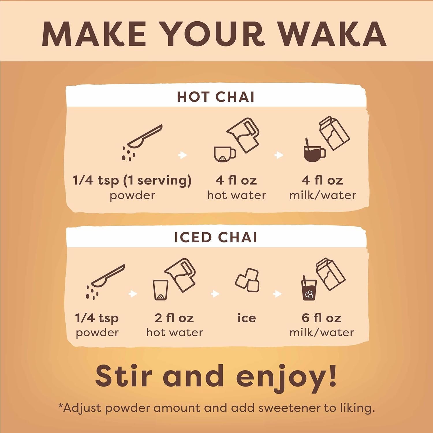 - ENJOY TEA AT HOME: Waka brings you a convenient, affordable, & high-quality tea experience you can enjoy at home - no steeping or brewing necessary. Just mix 1/4 tsp of Waka's chai blend with water, add your favorite milk and sweetener, and enjoy.