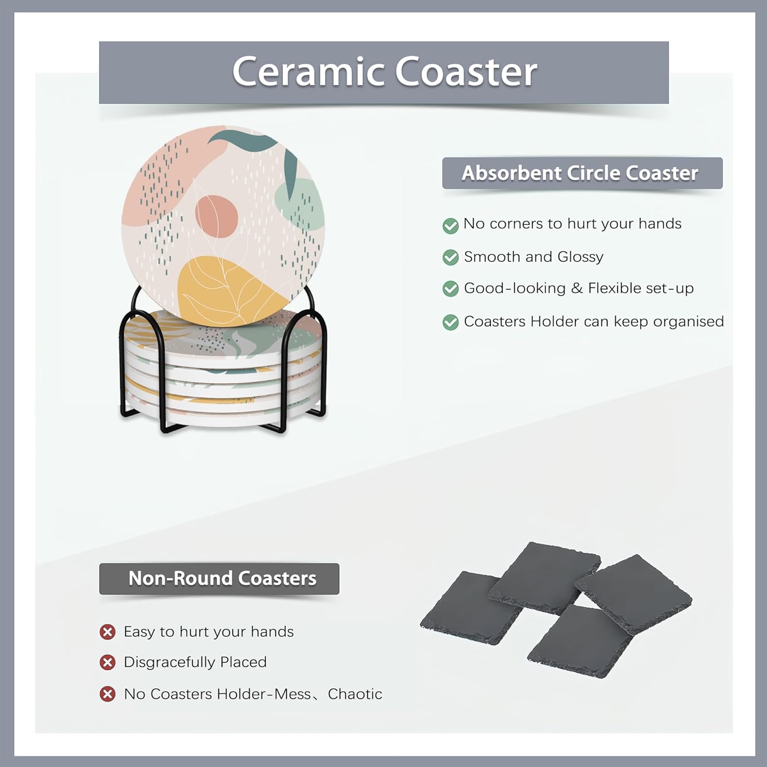 Drink Coasters Set of 6 with Holder,Abstract Dots and Leaves Absorbent Ceramic Coasters with Cork Base,Fit All Cups,Tabletop Protection Mat for Mugs and Cups,Office,Kitchen
