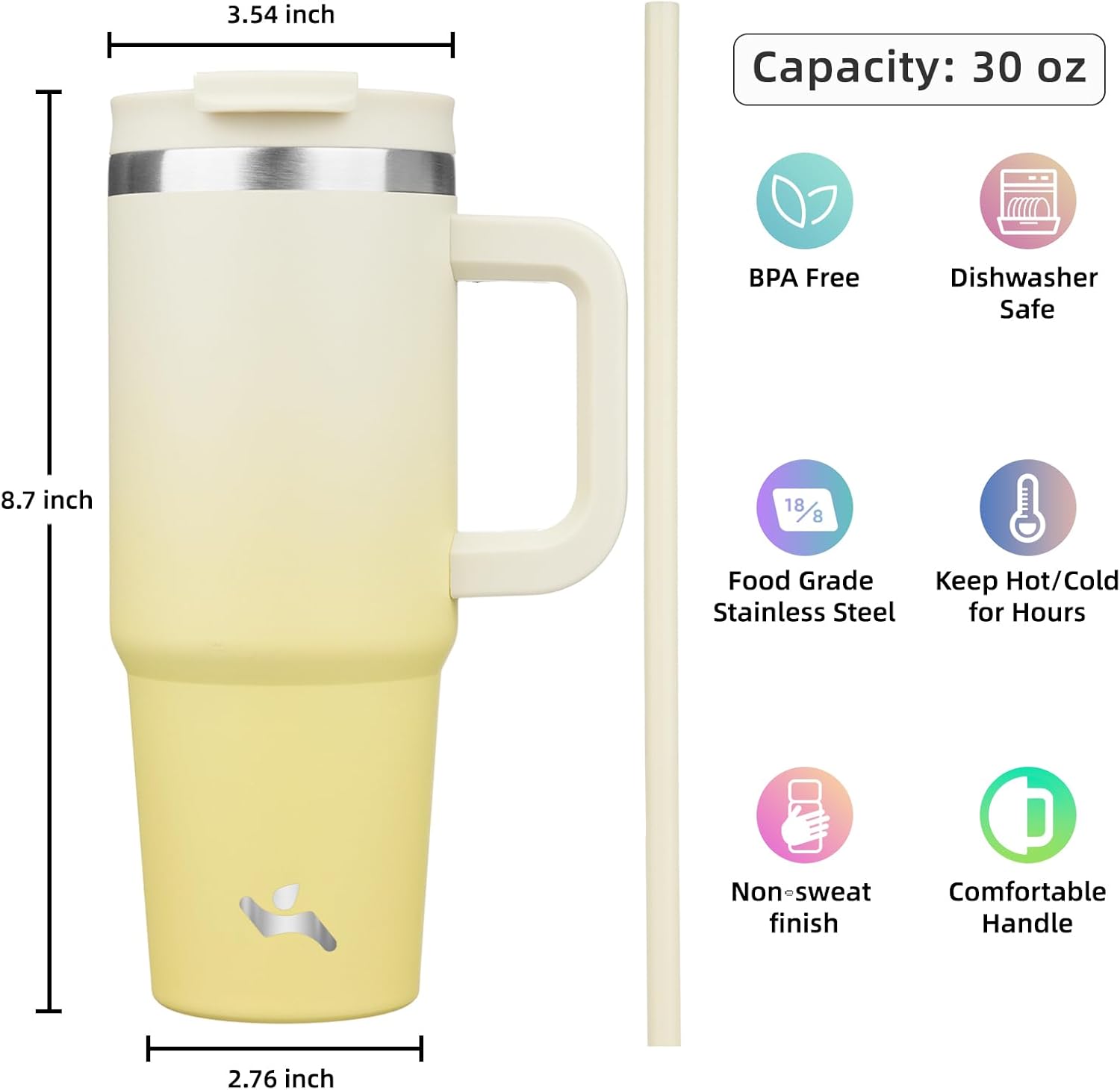 30 oz Tumbler with Handle and 2 Straws,2 in 1 Lid Insulated Water Bottle Stainless Steel Travel Coffee Mug,Lemon