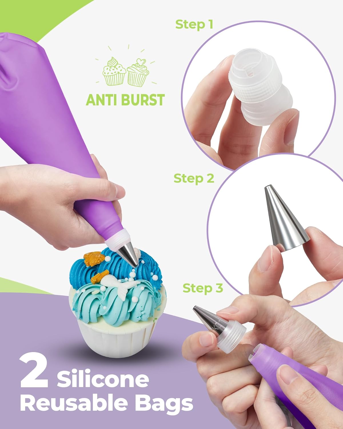 - Essential Cake Decorating Kit: 55 numbered stainless steel piping tips, 2 reusable piping bags, 20 disposable bags, 3 shapes of cake scraper, 3 reusable converters, 4 pastry bag ties, 1 flower lifter, 1 flower nail, and 1 tips brush. With these key baking tools, you'll be able to make cake decorating a piece of cake. Moreover, the User Guide is an eBook that has been carefully tailored to help you maximize your usage of this piping bags and tips set.