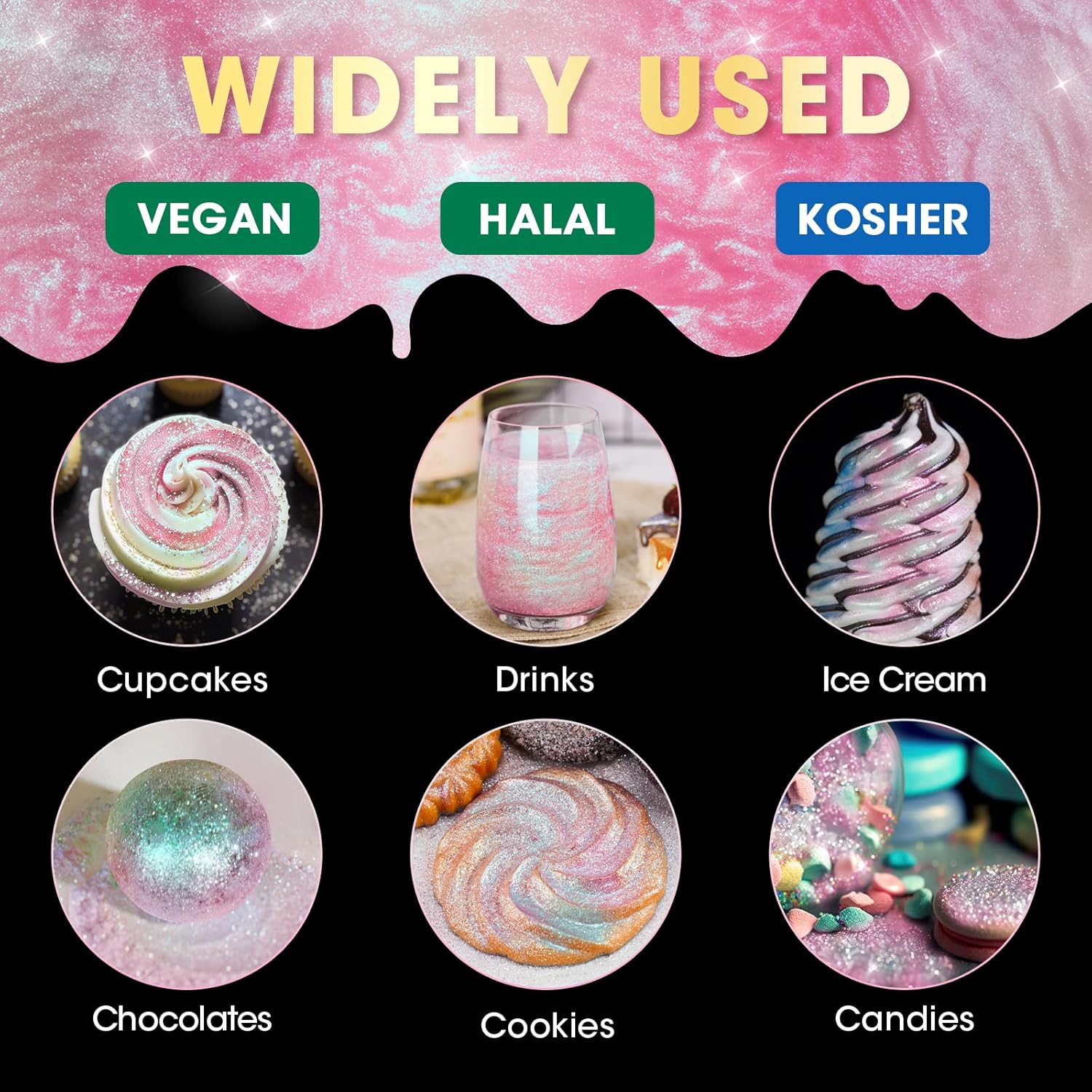 - ✔️【Vegan & Allergen-Free】Food-grade glitter uses only the highest quality vegan ingredients and does not contain common food allergens, including gluten, nuts or dairy products, so everyone can use and enjoy this product regardless of diet or food allergies. Unlike food contact glitter, these are 100% edible, so you don't need to worry about using them in your creations to make them sparkle for all.
