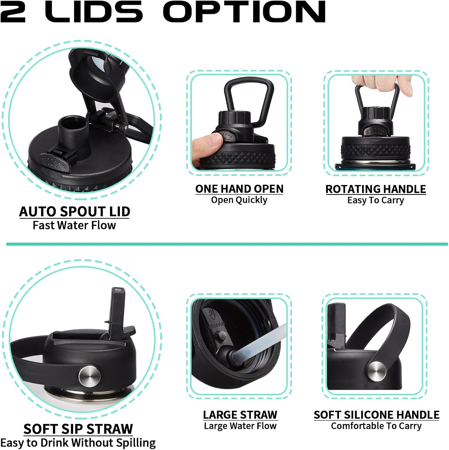 - 2 LIDS—100% Leak Proof: the auto spout cap & straw lid provide your different drinking experience. The ONE-HAND operation pop-up spout lid for convenient enjoy your fast water flow. The SPILL-PROOF straw lid with high flow rate & BPA free. Both 2 lids design with a sturdy handle, making the insulated water bottle more convenient to carry
