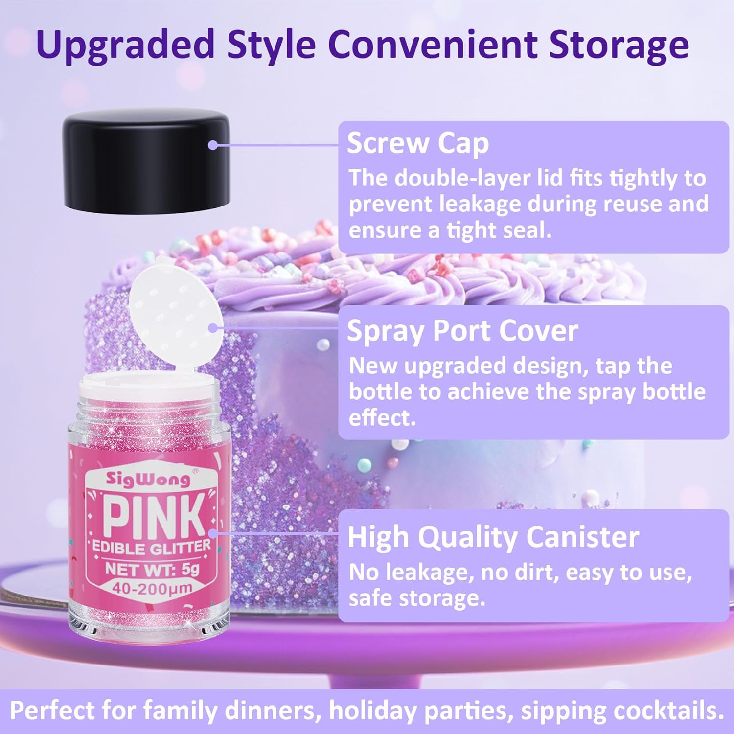 - EASY TO USE - The unique cap design of edible glitter allows you to control the amount of edible glitter well, it can be sprinkled directly on the surface of cakes, cookies and other food products, or mixed directly with cocktails, beverages, etc. for a sparkling and glamorous effect and gorgeous shine.
