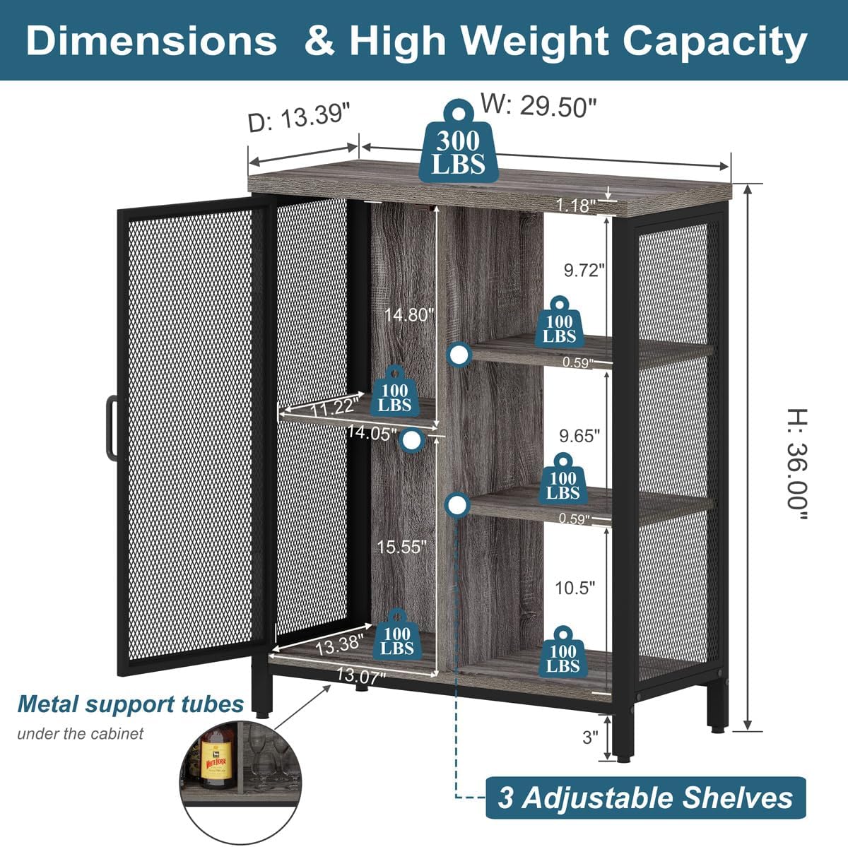 - Dimensions and Material: 29.50"W x 13.39"D x 36.00"H. Crafted with FSC-certified wood, our product supports sustainability and promotes responsible forest management. Crafted from high-quality MDF board with vintage oak wood grain finished that adds industrial touch to your home. We also use powder coating to seal up the steel and the metal of this accent cabinet won’t rust over time.
