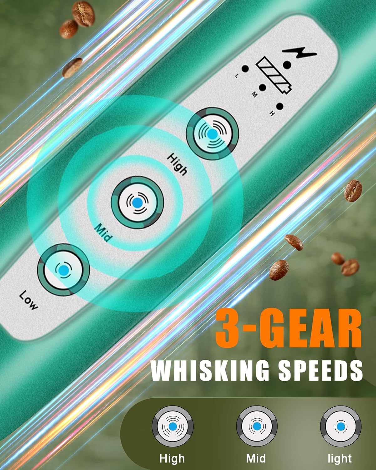 YUSWKO Rechargeable Milk Frother for Coffee, Handheld Drink Mixer with 3 Heads 3 Speeds, Ideal Coffee Frother Wand for Travel - Green