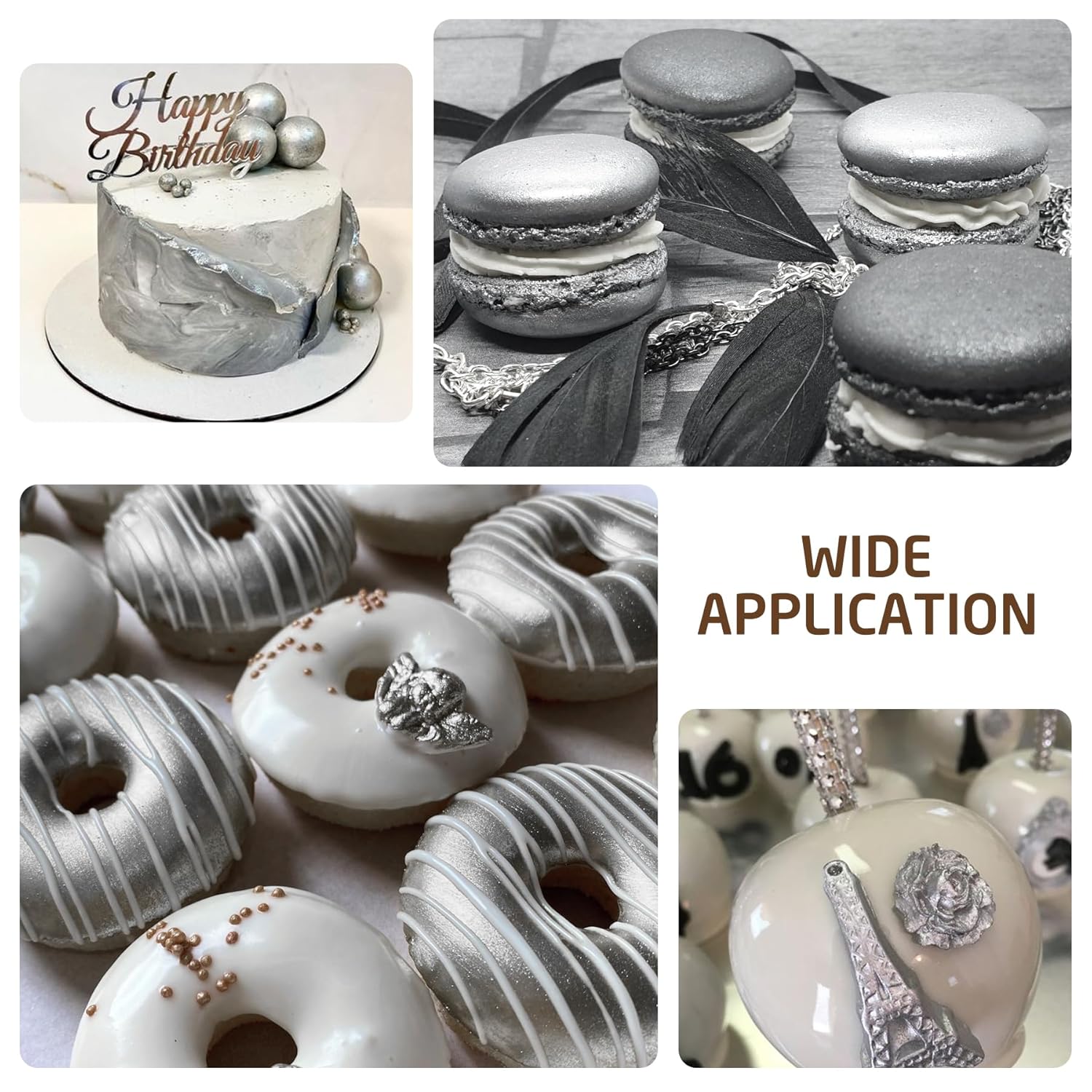 - METALLIC EDIBLE GLITTER PAINT - Specially crafted for food and baking decoration to get a metallic finish or add a gold-plated effect. All colors are brilliant and amazing. This fine texture edible cake paint can provide a high luster glitter effect to your cakes, chocolates, and candy!