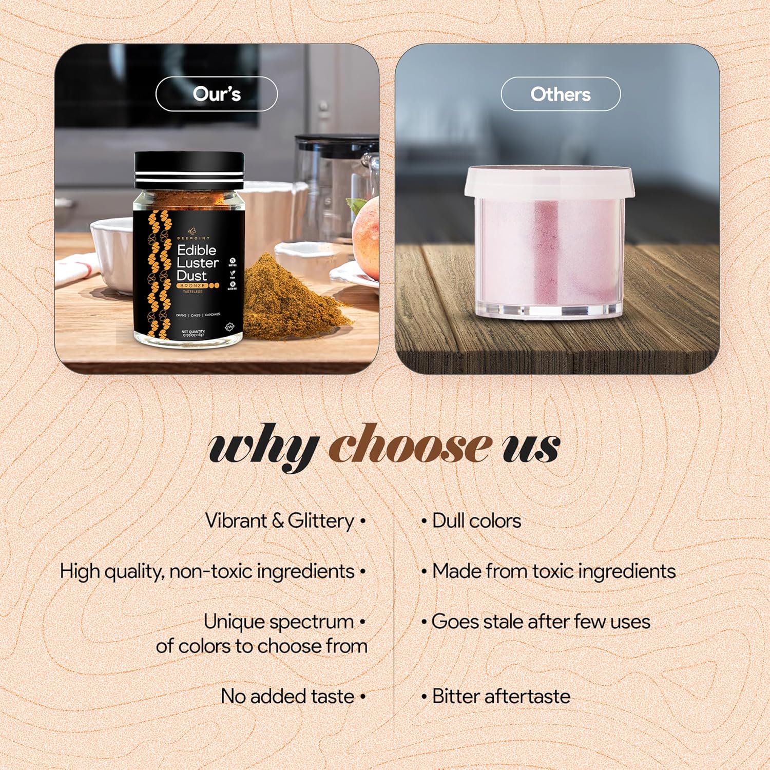 - Elevate Your Look with Precision: Experience the allure of our enhanced formula edible luster dust powder. With its refined texture, a mere dab achieves your desired effect. Each bottle contains 15g of transformative brilliance