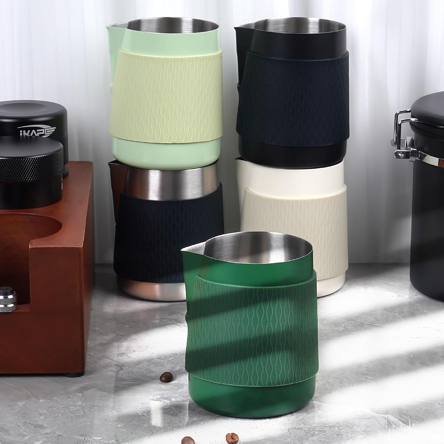 - Better Latte Art - Making espresso should be an enjoyable process in our lives. This handle-less steaming pitcher comes with a piece of silicone cushion for a comfortable grip and smooth force delivery, allowing you to feel comfortable and use less force during the brewing process, taking your coffee experience to the next level
