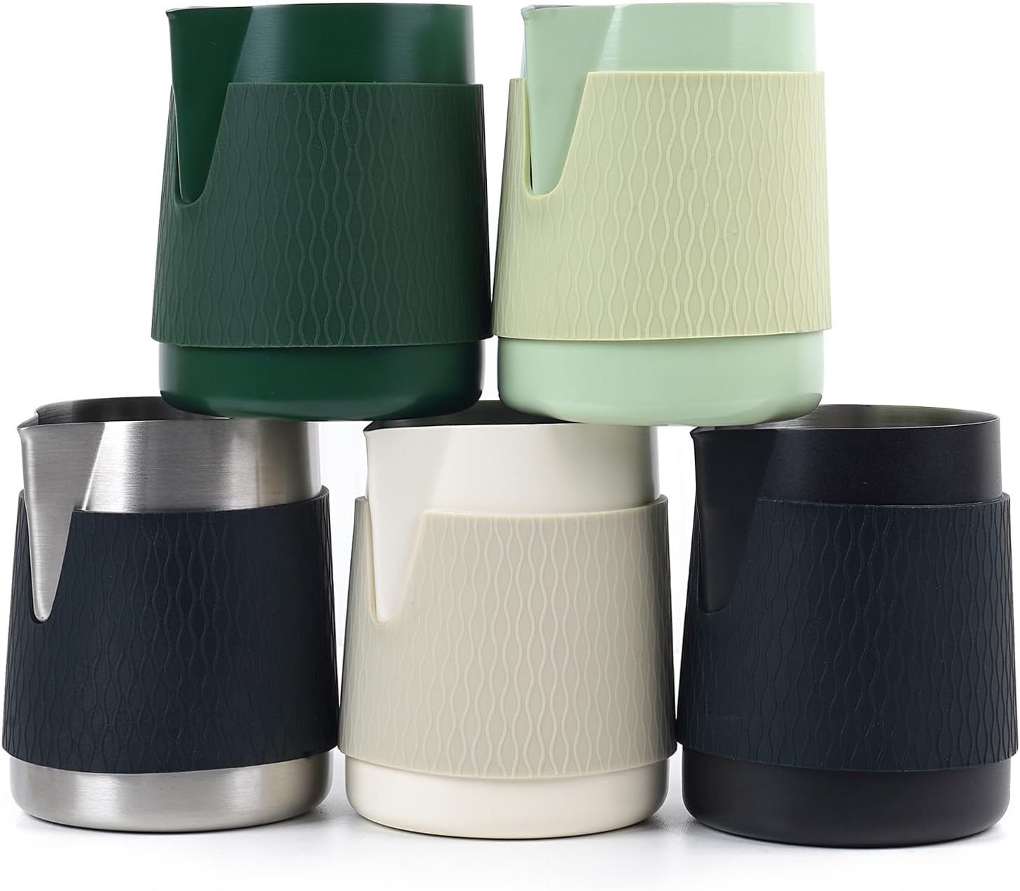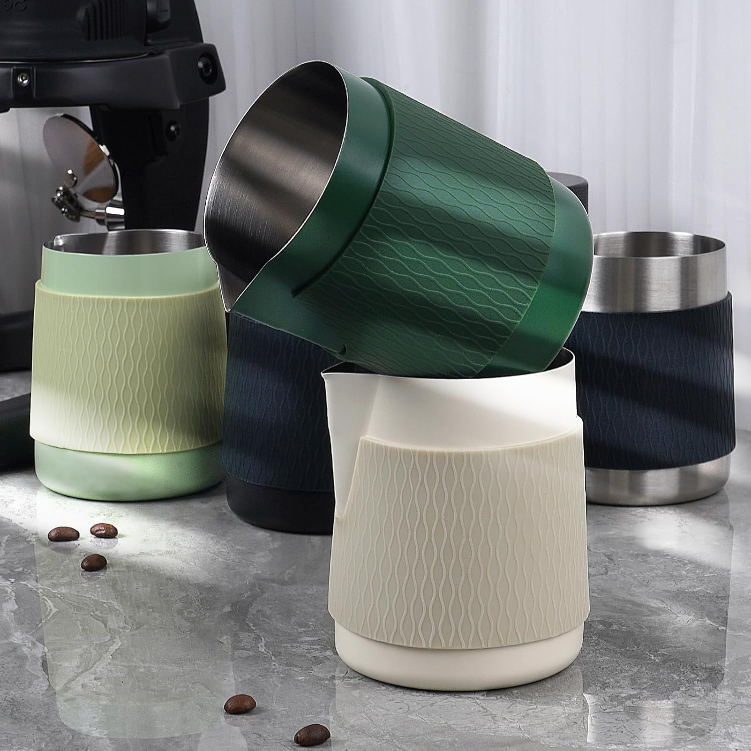 - Better Latte Art - Making espresso should be an enjoyable process in our lives. This handle-less steaming pitcher comes with a piece of silicone cushion for a comfortable grip and smooth force delivery, allowing you to feel comfortable and use less force during the brewing process, taking your coffee experience to the next level