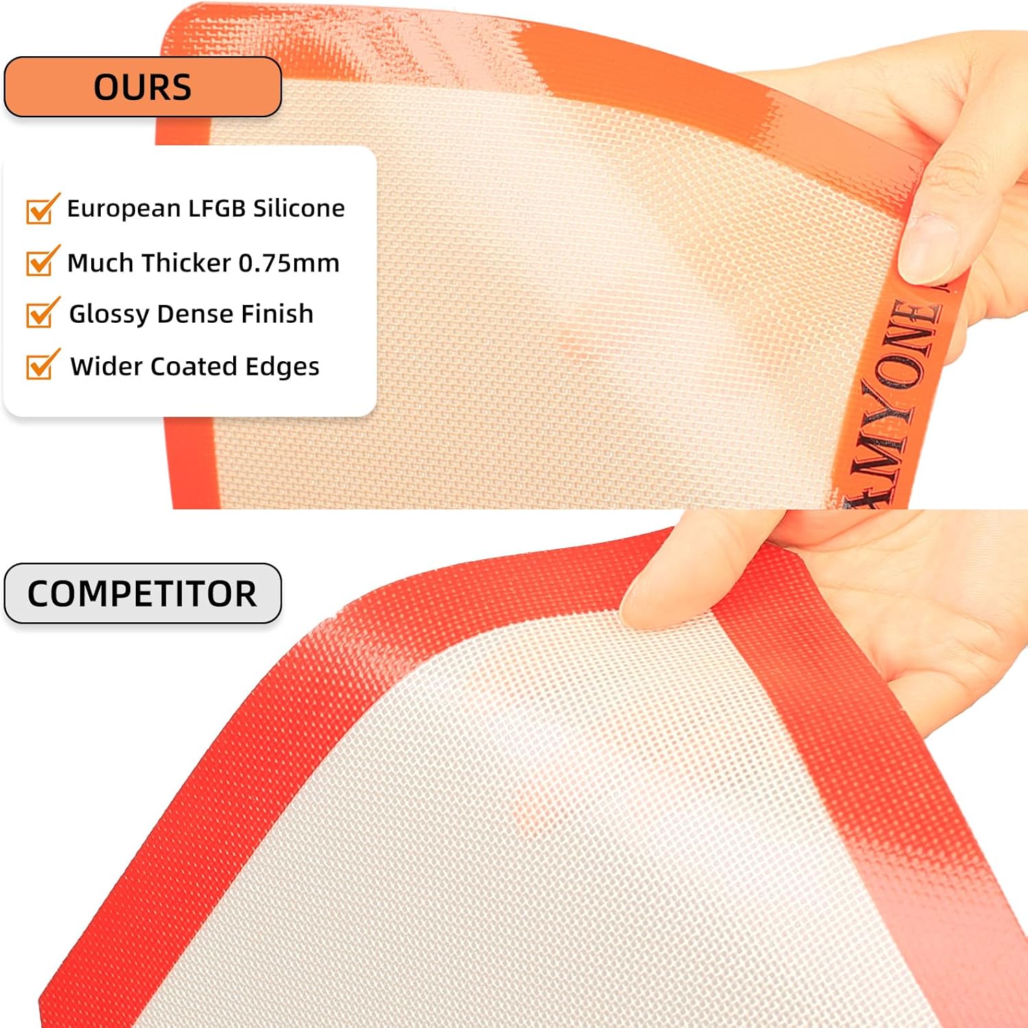 - 🧀【TOP-QUALITY ROBUST CONSTRUCTION】Crafted from premium food-grade silicone and internally reinforced with fiberglass, this full silicone baking mat is built to last. It meets European standard, guaranteeing reliable performance for all your baking needs. With a thickness of 0.75mm and with glossy dense finish as well as wider coated edges, these baking mats for full size sheets, can withstand temperatures ranging from -40°F to 480°F making it suitable for a wide range of baking needs.