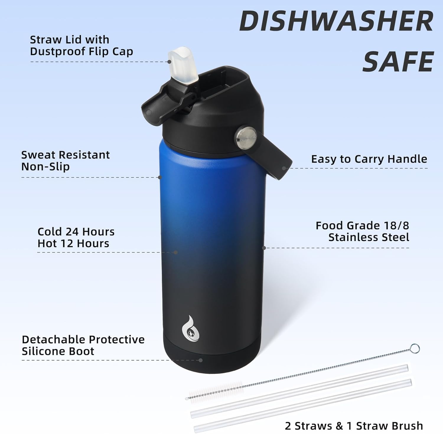- NON-SLIP PROTECTIVE BOOT & DISHWASHER SAFE: This stainless steel water bottle comes with a detachable silicone boot to protect the bottom from bump damage. The wide mouth design of our water cup allows for easy filling, pouring, and cleaning. With 2 straws and 1 straw brush, you can easily clean the nozzle and straw with straw brush. It is also dishwasher safe, saving you time and effort in maintaining its cleanliness and hygiene