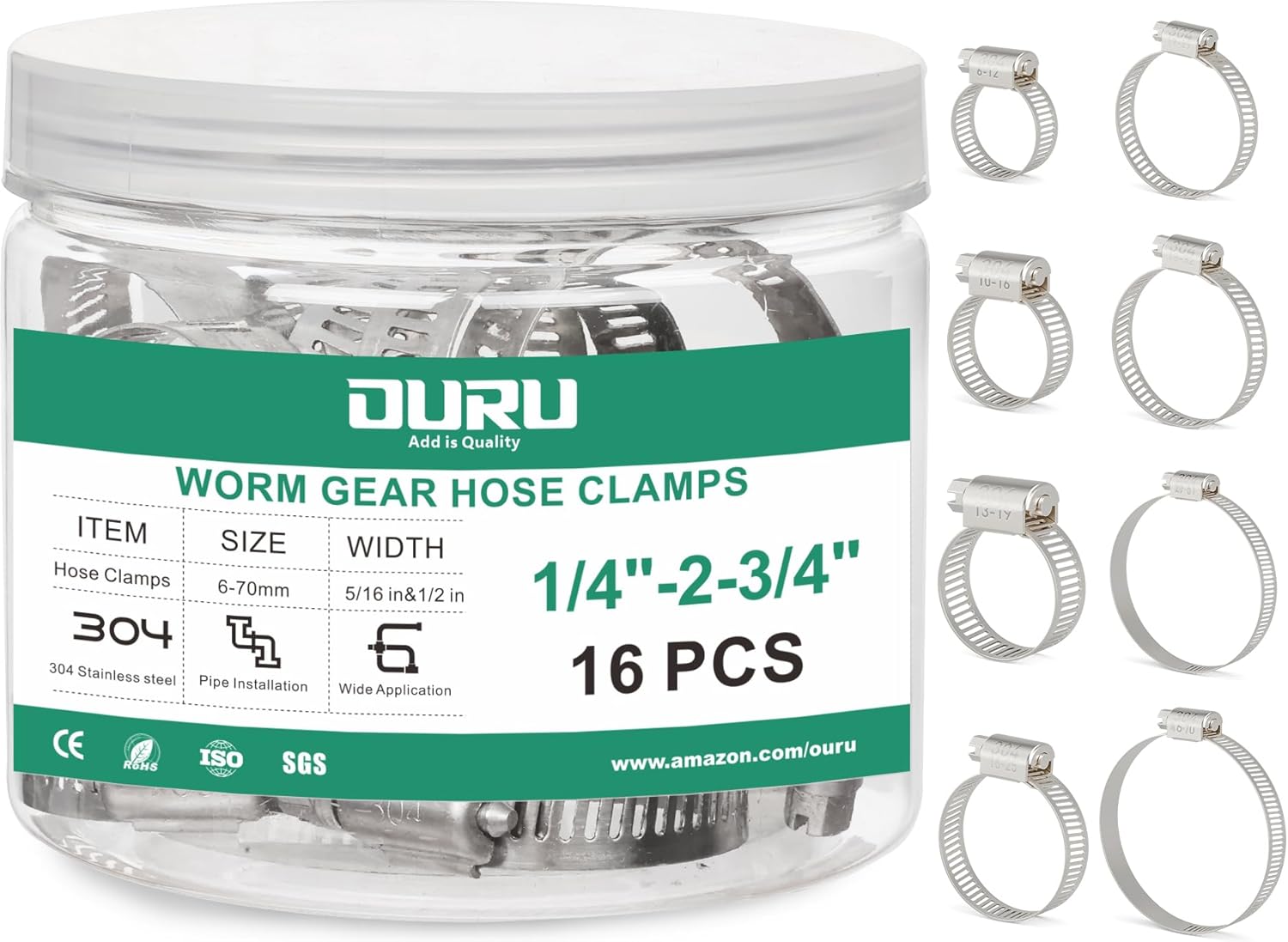 16PCS Hose Clamps Stainless Steel Adjustable 1/4"– 2-3/4"(6-70mm) Worm Gear Hose Clamp, Heavy Duty Metal Small Hose Clamps for Automotive, Pipe, Radiator Plumbing, Fuel Line