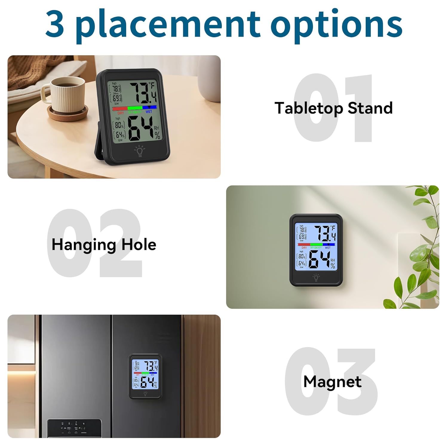 - 【THREE METHODS OF INSTALLATION】:Humidity thermometer is available in table stand, hanging hole and magnet mounting. There is a separate bracket, which can be placed on a table or bookshelf, and can also be fixed with a magnet or hanging hole.