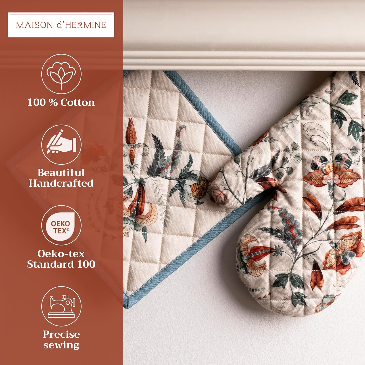 - Package includes: Set includes 1 oven mitt (7.5 x 13") and 1 pot holder (8 x 8"), perfect for baking, roasting, and cooking. Made from 100% cotton for reliable protection. Our products are Designed in Europe and Made in India