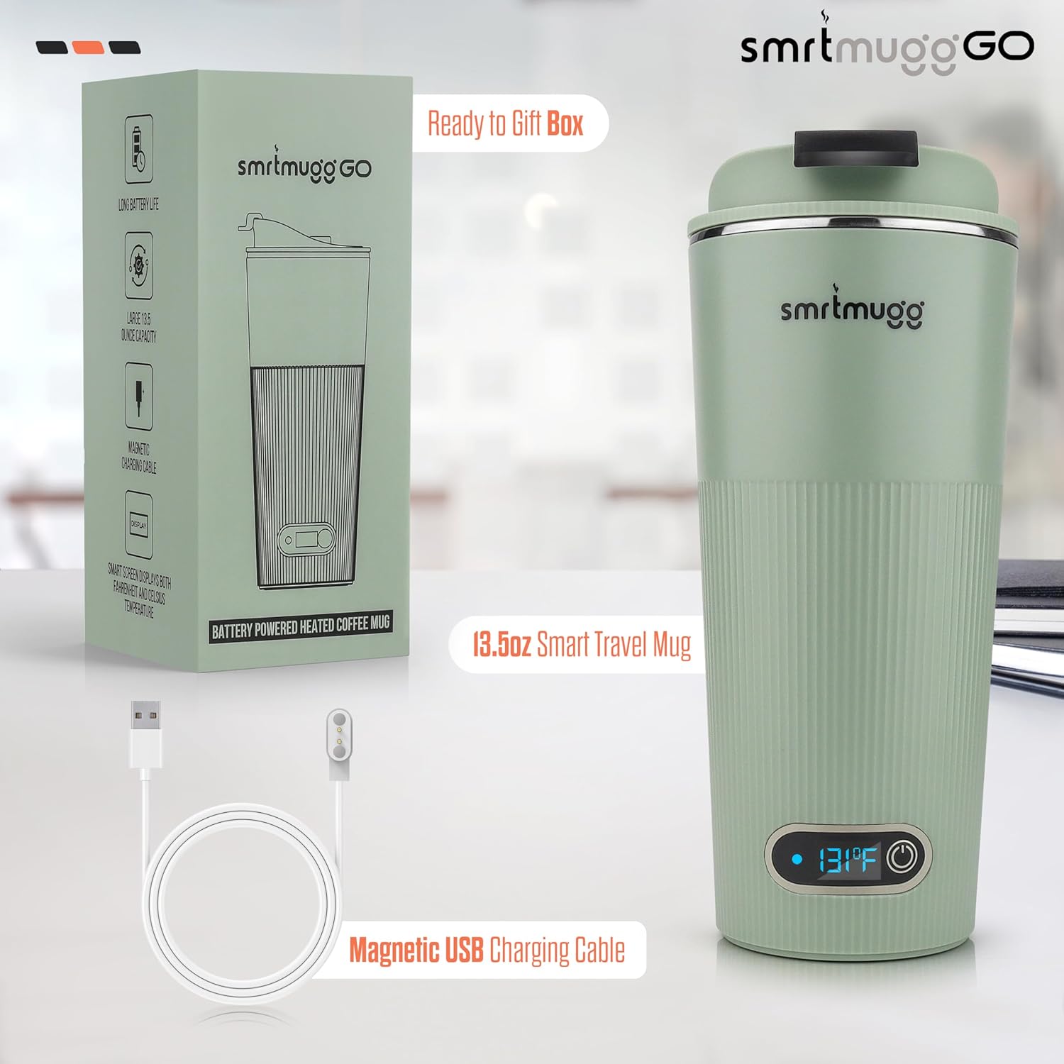GO Heated Coffee Mug, Travel Mug, 13.5 OZ. Smart Mug, Battery Powered Heated Coffee Mug, Great for Coffee and Tea, Snap on Magnetic Charging Cord, New and Improved (Mint Green)