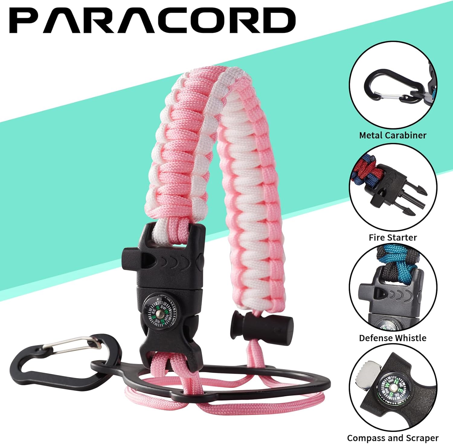 - UNIQUE DESIGNS PARACORD HANDLE: Full-function paracord handle made in individual styles to match the color of the flask water bottles. With compass, safety ring, carabiner, flint fire starter & whistle. It unravels into a sturdy and taut rope in an emergency, making the large water jug an ideal survival kit for expeditions in the wild