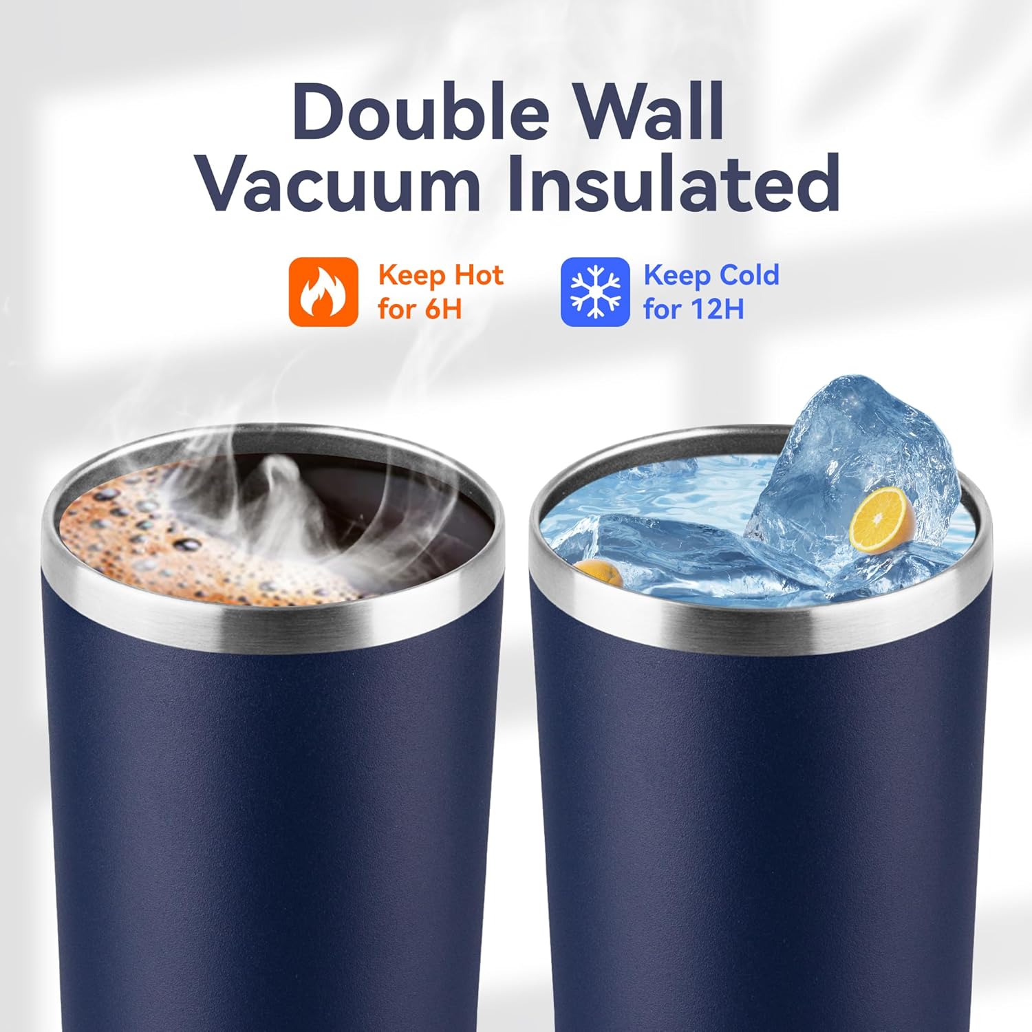 - DOUBLE WALL VACUUM INSULATION:Enjoy Beverage Cold or Hot. Under normal temperature, it can keep a tumbler of ice for 12h until the ice totally melt, or hot coffee warm for 6h