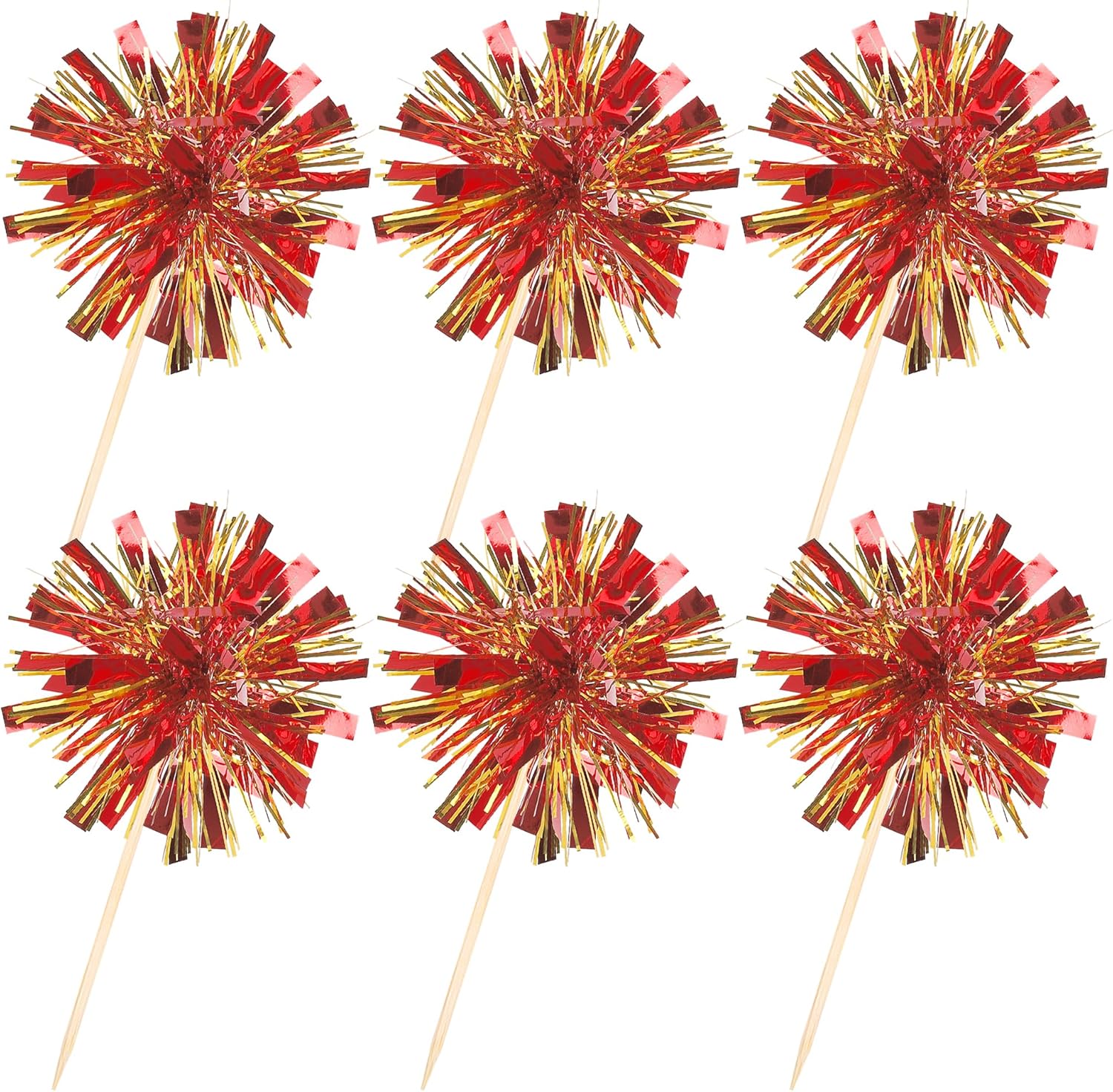 30 PCS Foil Firework Cupcake Toppers Sparkle Tinsel Cupcake Picks Happy Birthday Cake Decorations Drink Stirrers Cocktail Food Fruit Toothpicks for Baby Shower Graduation Party Supplies Red Gold