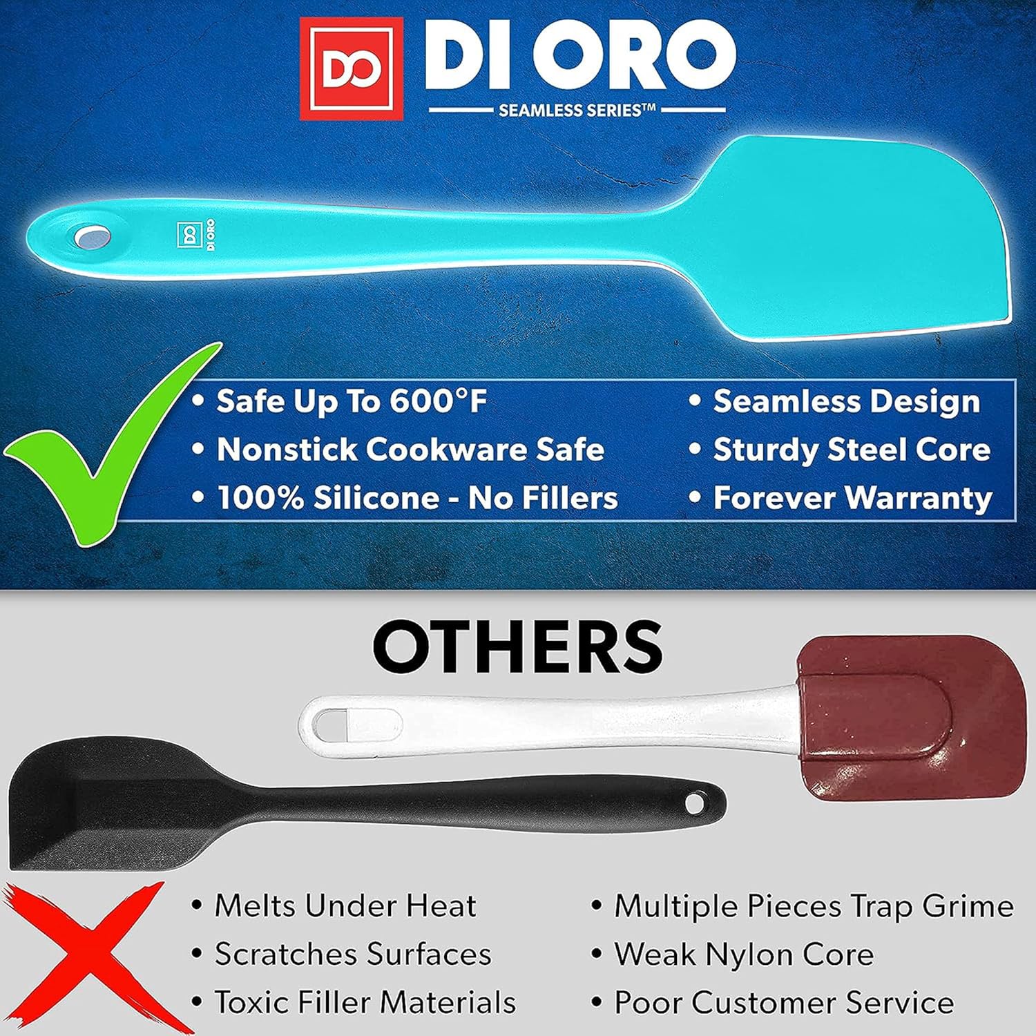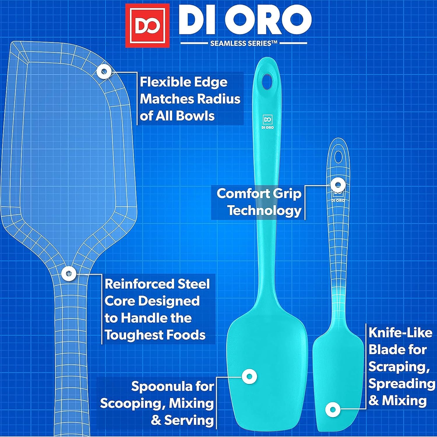 - CLEANS EASY, SEAMLESS ONE-PIECE DESIGN – You will be happy to know that your Award-Winning DI ORO Seamless Series Spatulas are dishwasher safe or can be quickly and effortlessly cleaned by hand. The one-piece seamless silicone design prevents buildup of food and grime, which allows for safe and healthy cooking.