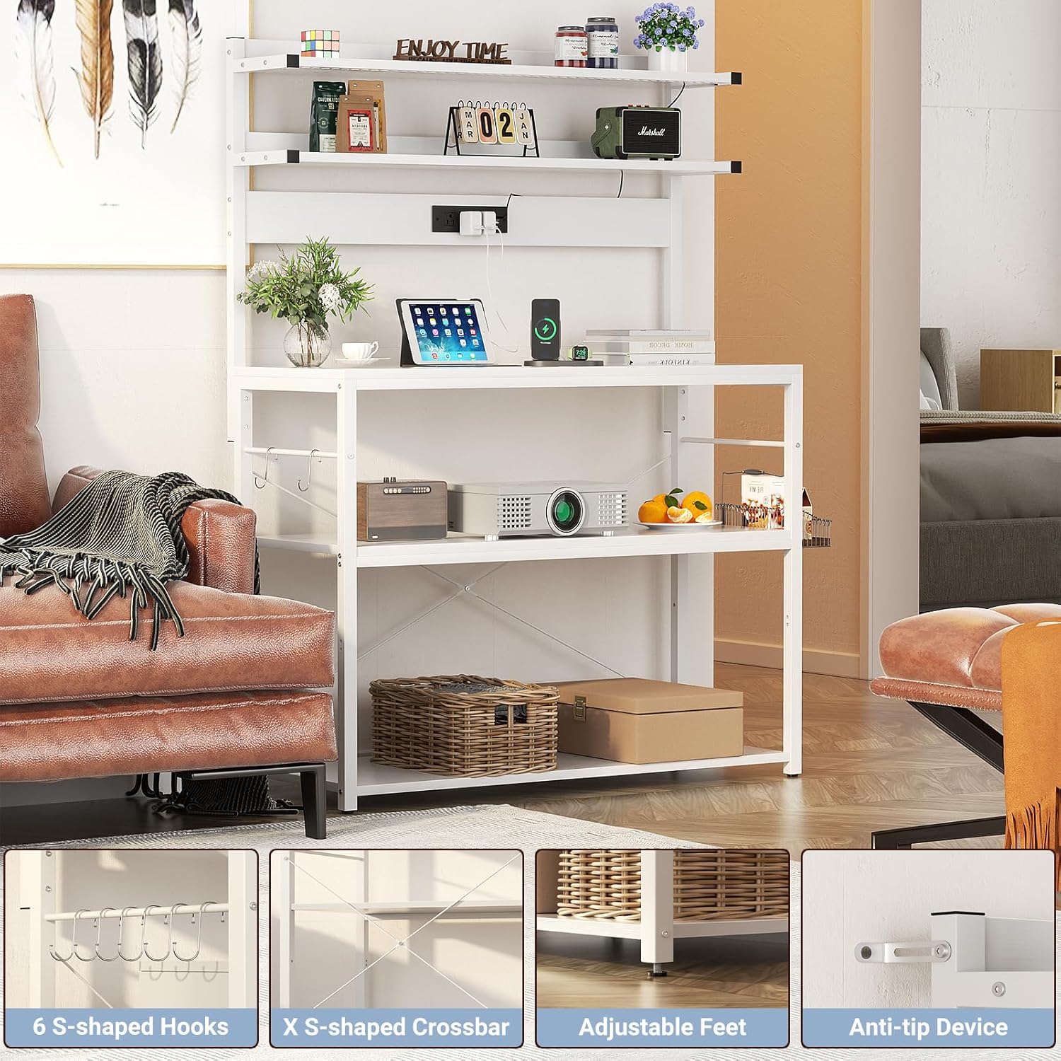 Aheaplus Bakers Rack with Power Outlet, Microwave Stand, 5 Tiers Coffee Bar Station with Led Lights, Kitchen Storage Shelf with 6 S-Shaped Hooks, Kitchen Rack Coffee Bar Stand, White