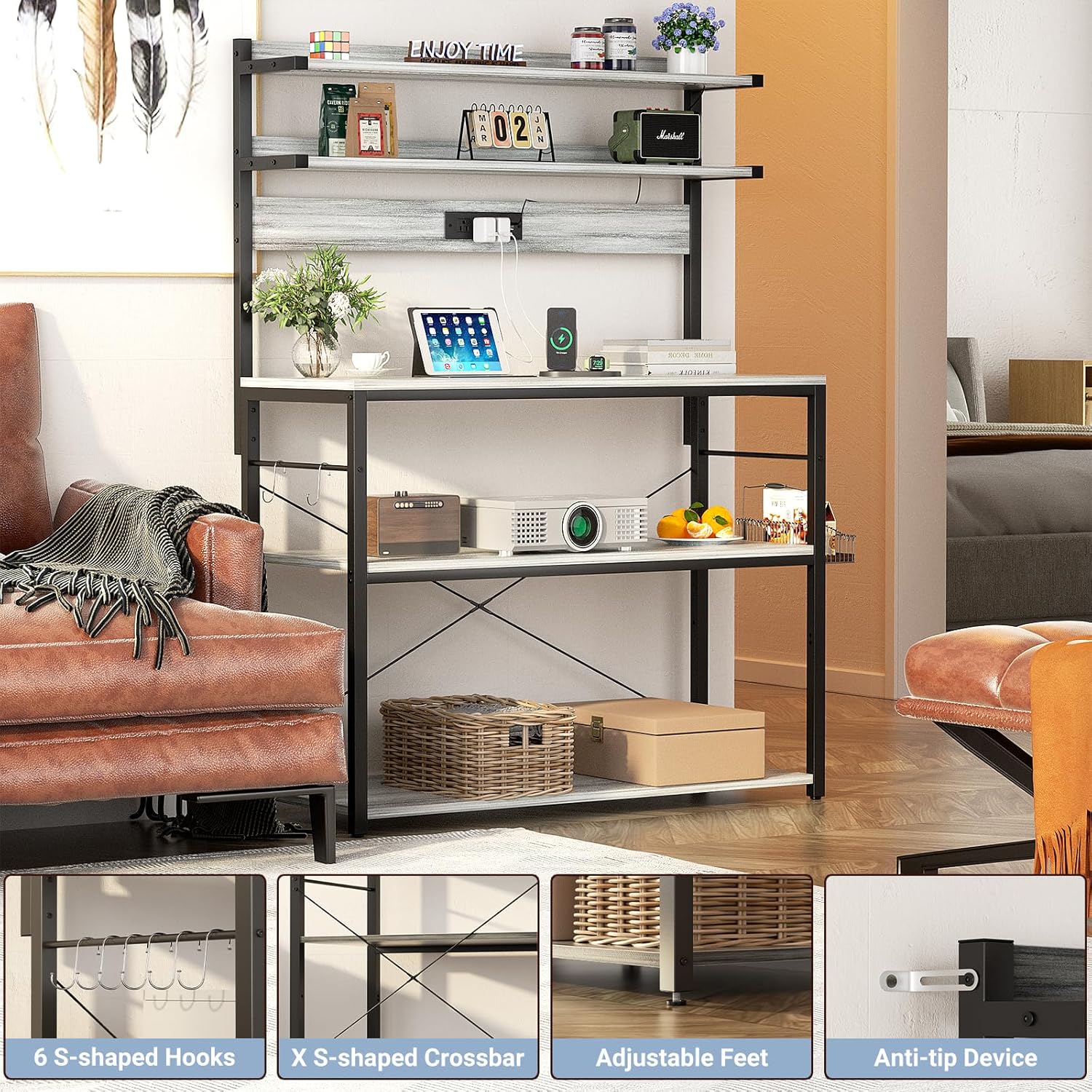 Aheaplus Bakers Rack with Power Outlet, Microwave Stand, 5 Tiers Coffee Bar Station with Led Lights, Kitchen Storage Shelf with 6 S-Shaped Hooks, Kitchen Rack Coffee Bar Stand, White Oak
