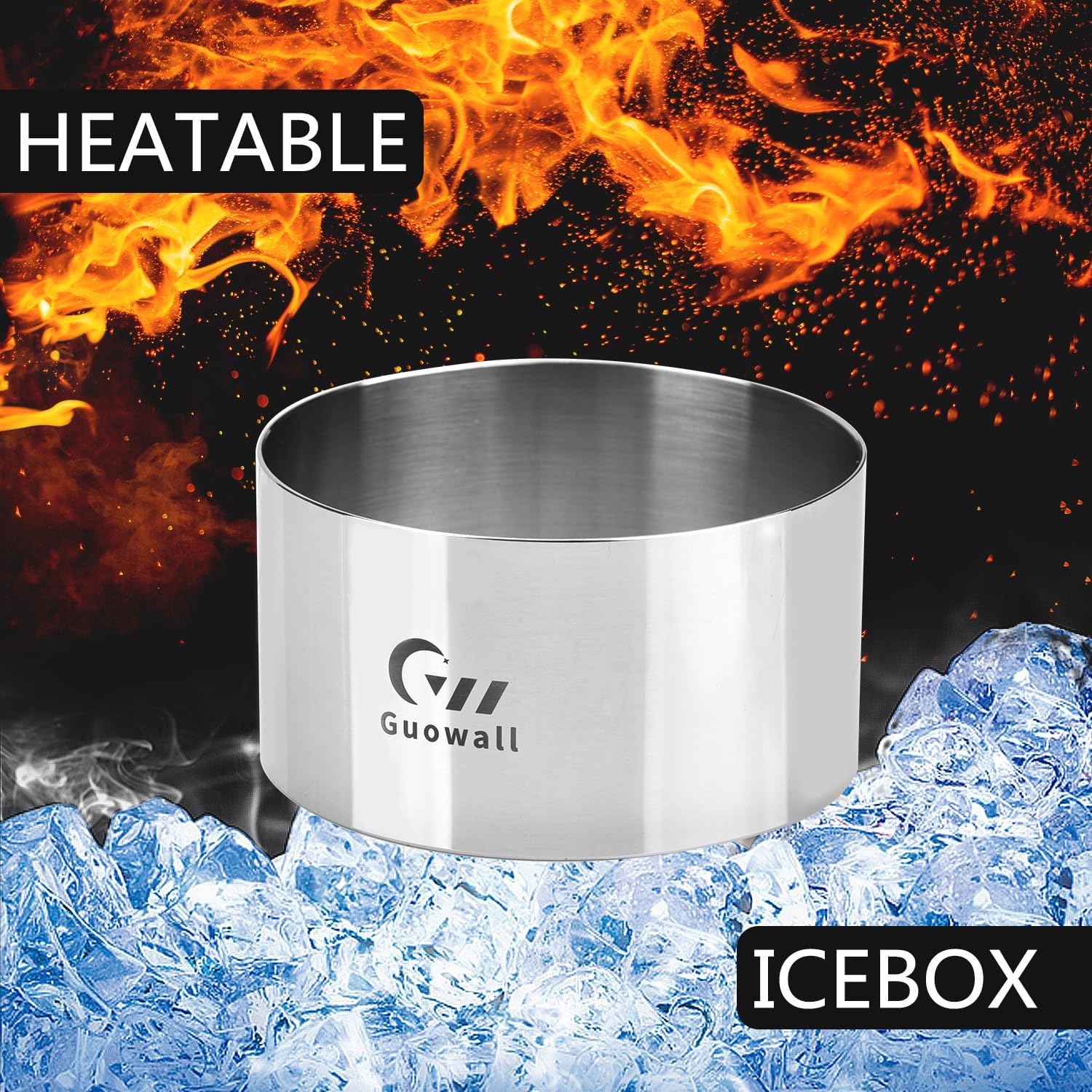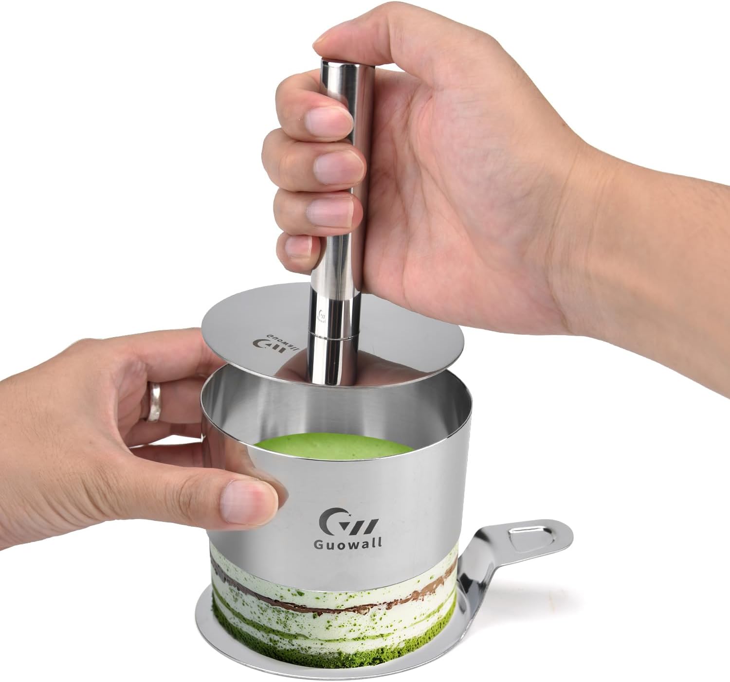 Guowall 4 pack Seamless Mousse Cake Ring set Stainless Steel 4 inch Round Food Mold Dessert Cutter for Baking (Includes 1 Lifter, 1 Pusher and 4 Rings)