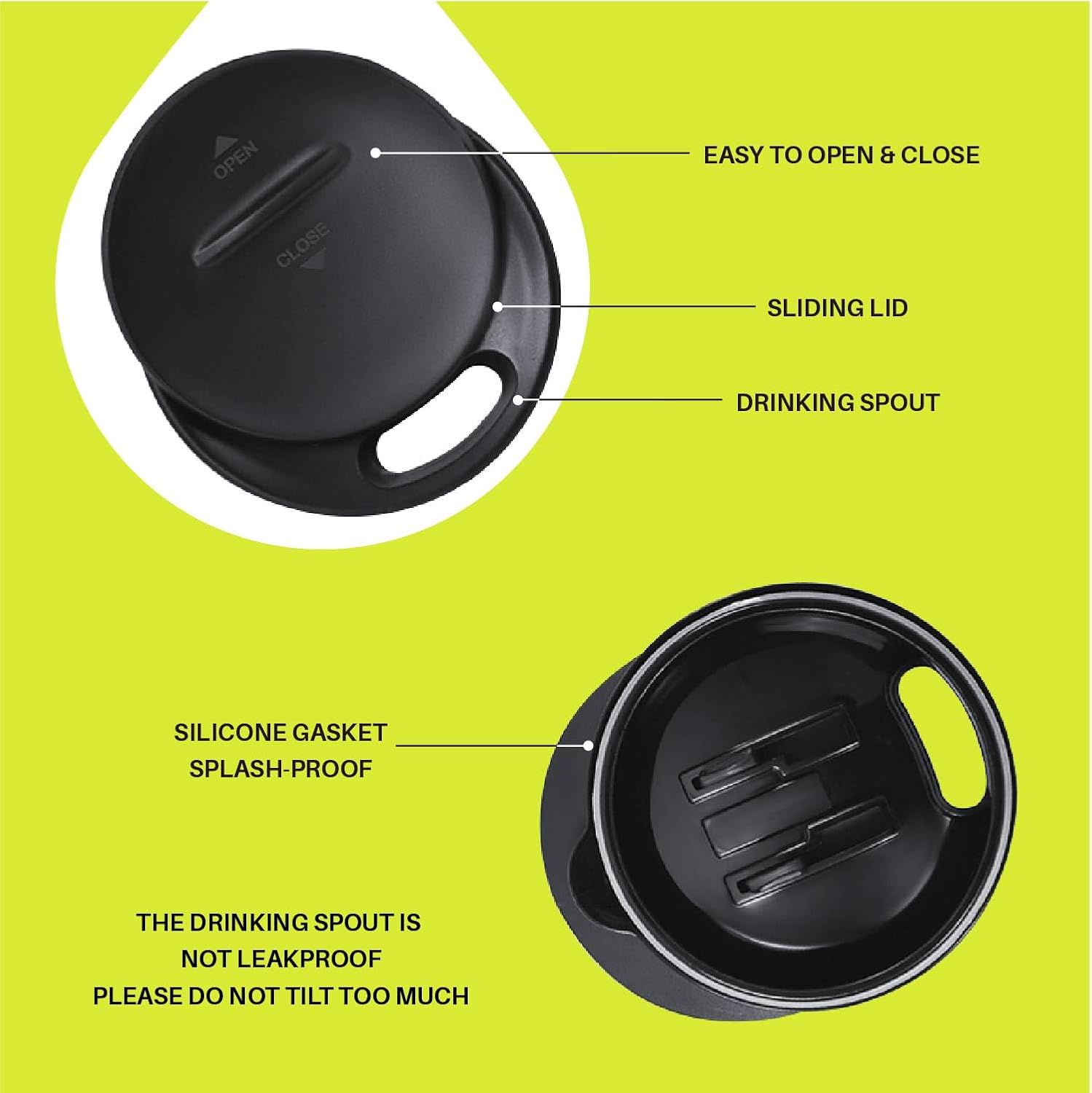 - 【PRESS-IN LID】- Silica gasket seals to achieve maximum spillproof capability. Drinking hole on the top, with a splash-proof sliding cover. Please note it is to keep drinks contained and prevent heat/cold from escaping. It is not leakproof.