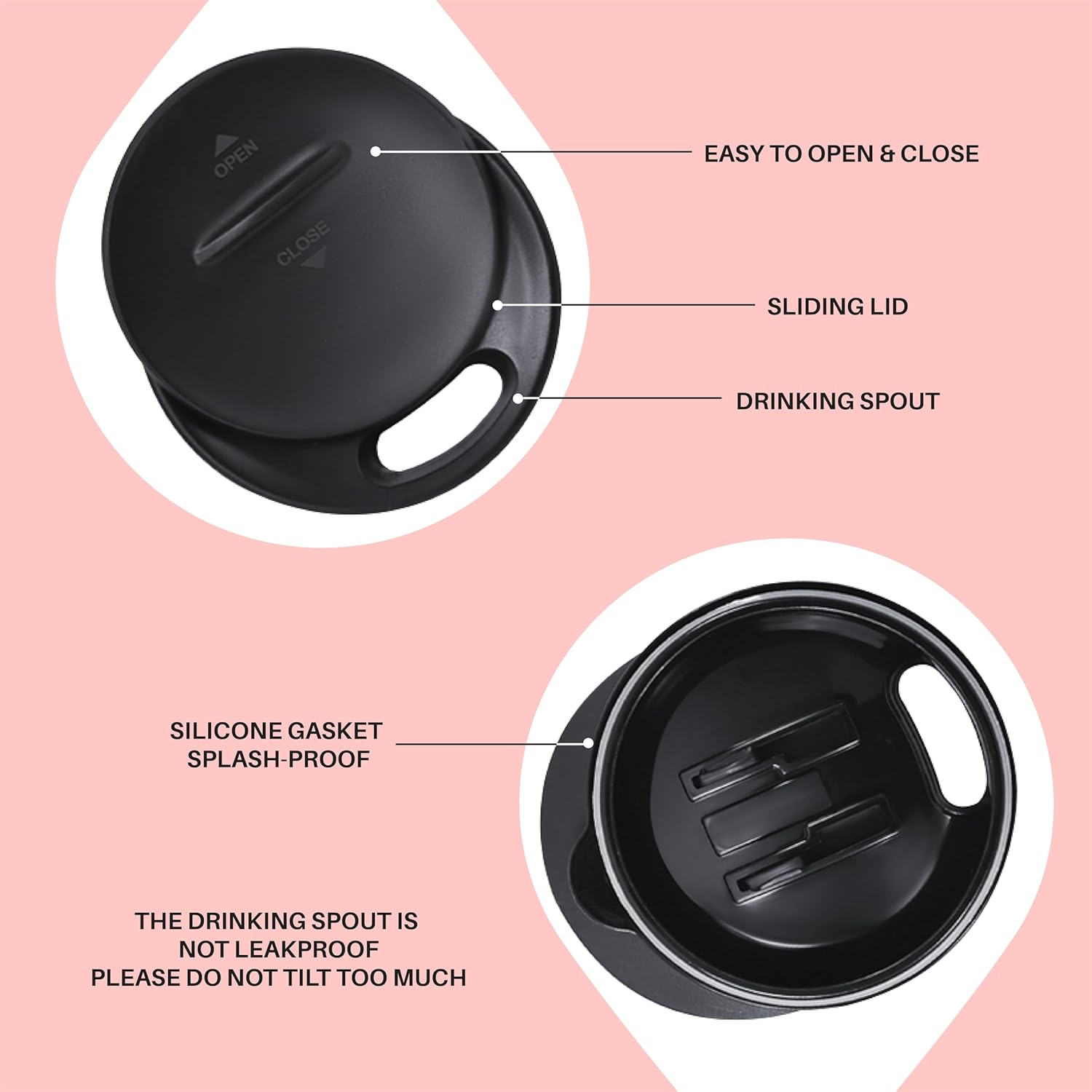 - 【PRESS-IN LID】- Silica gasket seals to achieve maximum spillproof capability. Drinking hole on the top, with a splash-proof sliding cover. Please note it is to keep drinks contained and prevent heat/cold from escaping. It is not leakproof.