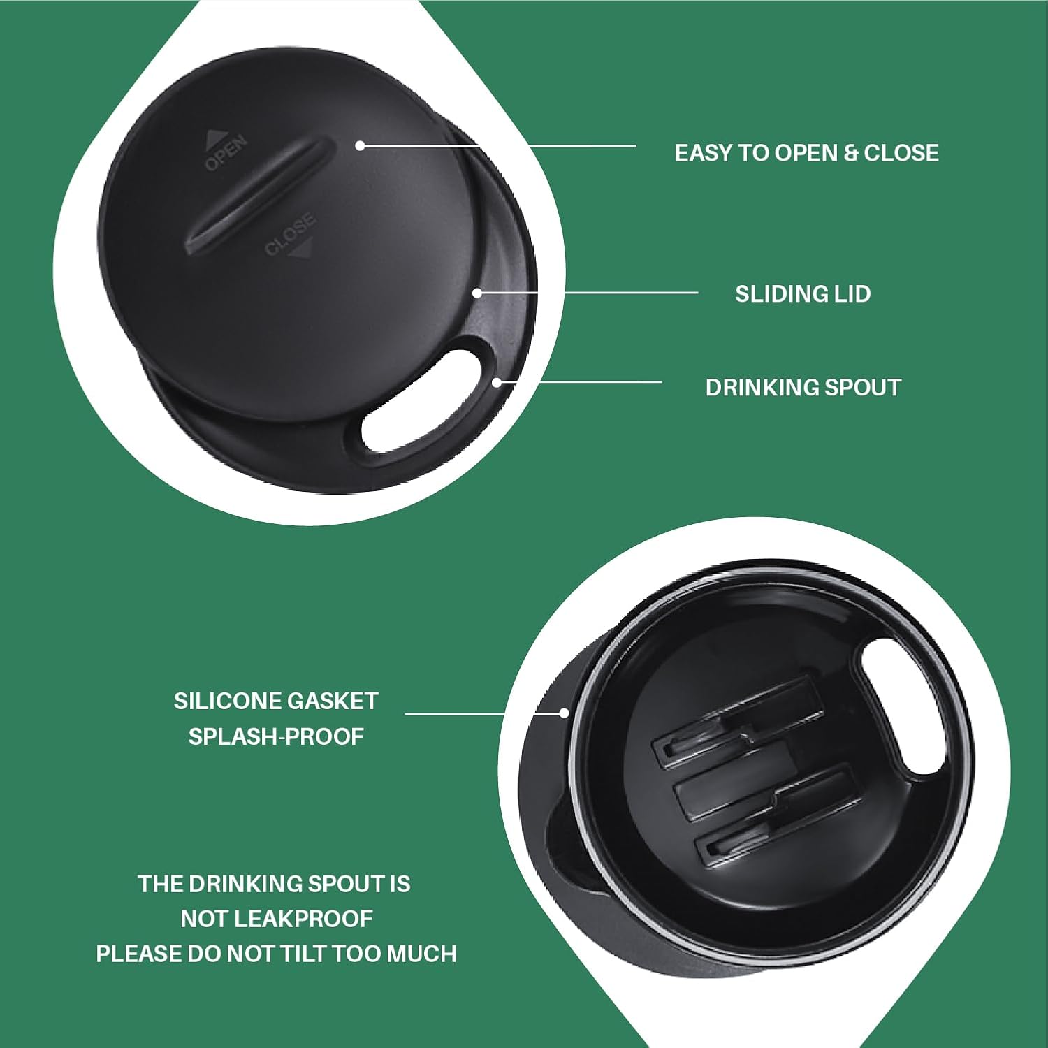 - 【PRESS-IN LID】- Silica gasket seals to achieve maximum spillproof capability. Drinking hole on the top, with a splash-proof sliding cover. Please note it is to keep drinks contained and prevent heat/cold from escaping. It is not leakproof.