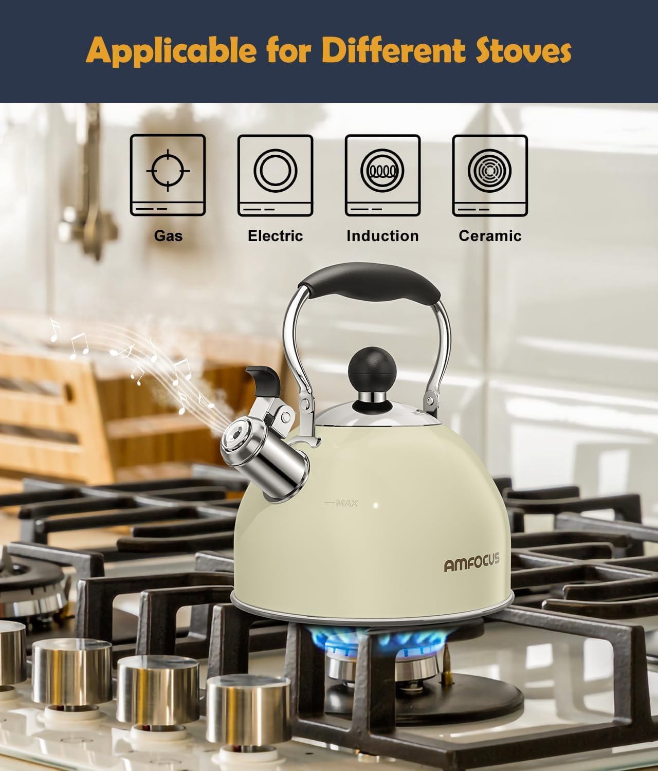 - ✔Loud Whistling Teapot: Our whistling tea kettle have loud & automatic vivid whistles, which will catch your attention when you focus on housework,movies,cooking in next door. It prevents you from forgetting to turn off the stovetop that causing water to be boiled dry or over-boiling.(NOTE: Pls keep the water level is below the spout of the kettle to ensure that the whistle is working properly.)