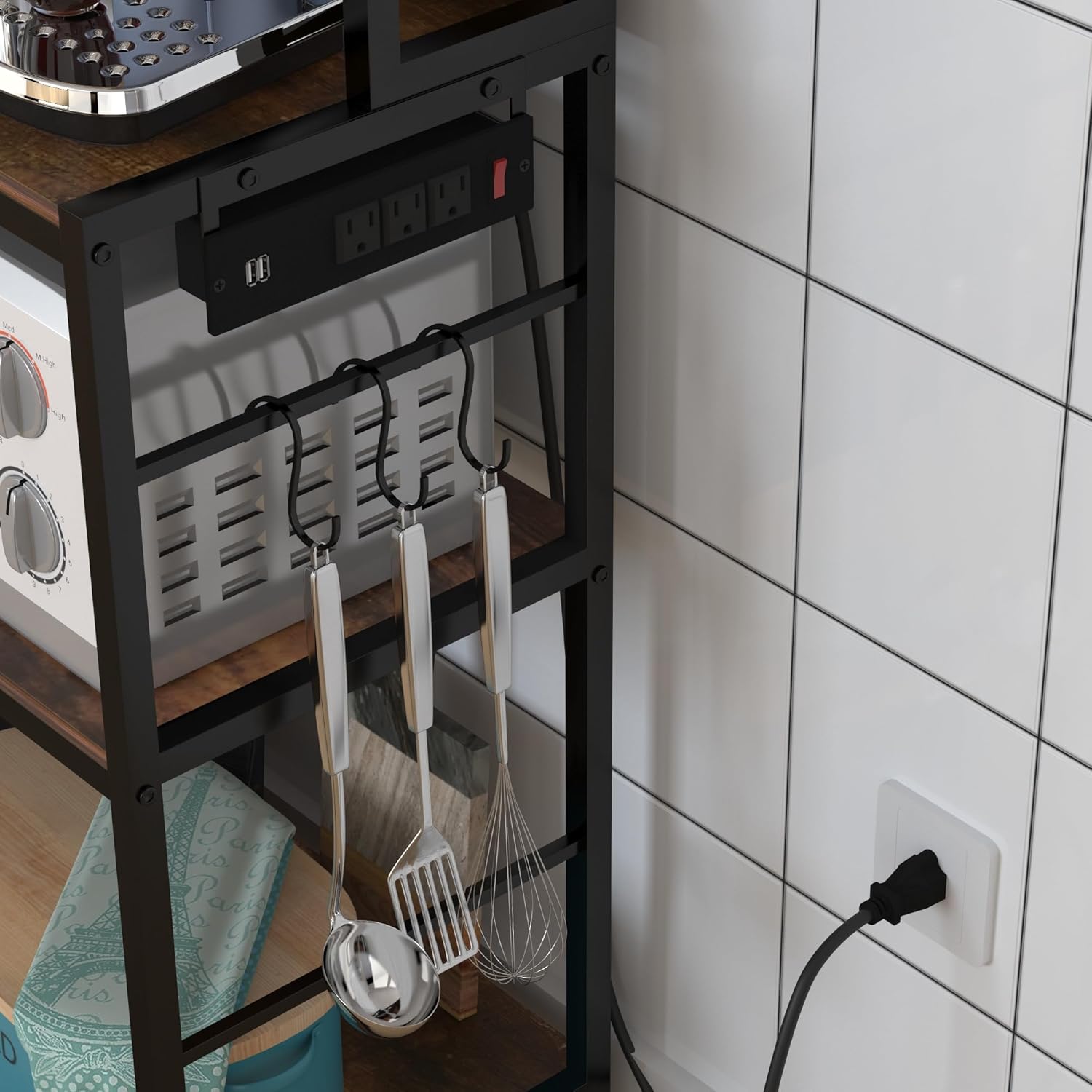 Bakers Rack with Baskets and Power Outlet, 5-Tier Kitchen Utility Storage Shelf with Hooks, Microwave Oven Stand Rack, Vintage Brown Free Standing Kitchen Shelf