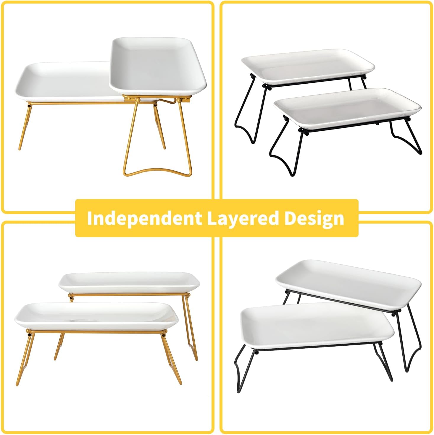- Practical Tiered Tray Design - Our ingenious 2 tiered serving Trays use the new foldable stand. Then you can customize the placement you want to maximize your space.It brings a touch of elegance to your table, making serving a breeze and allowing guests to indulge in a feast of convenience.