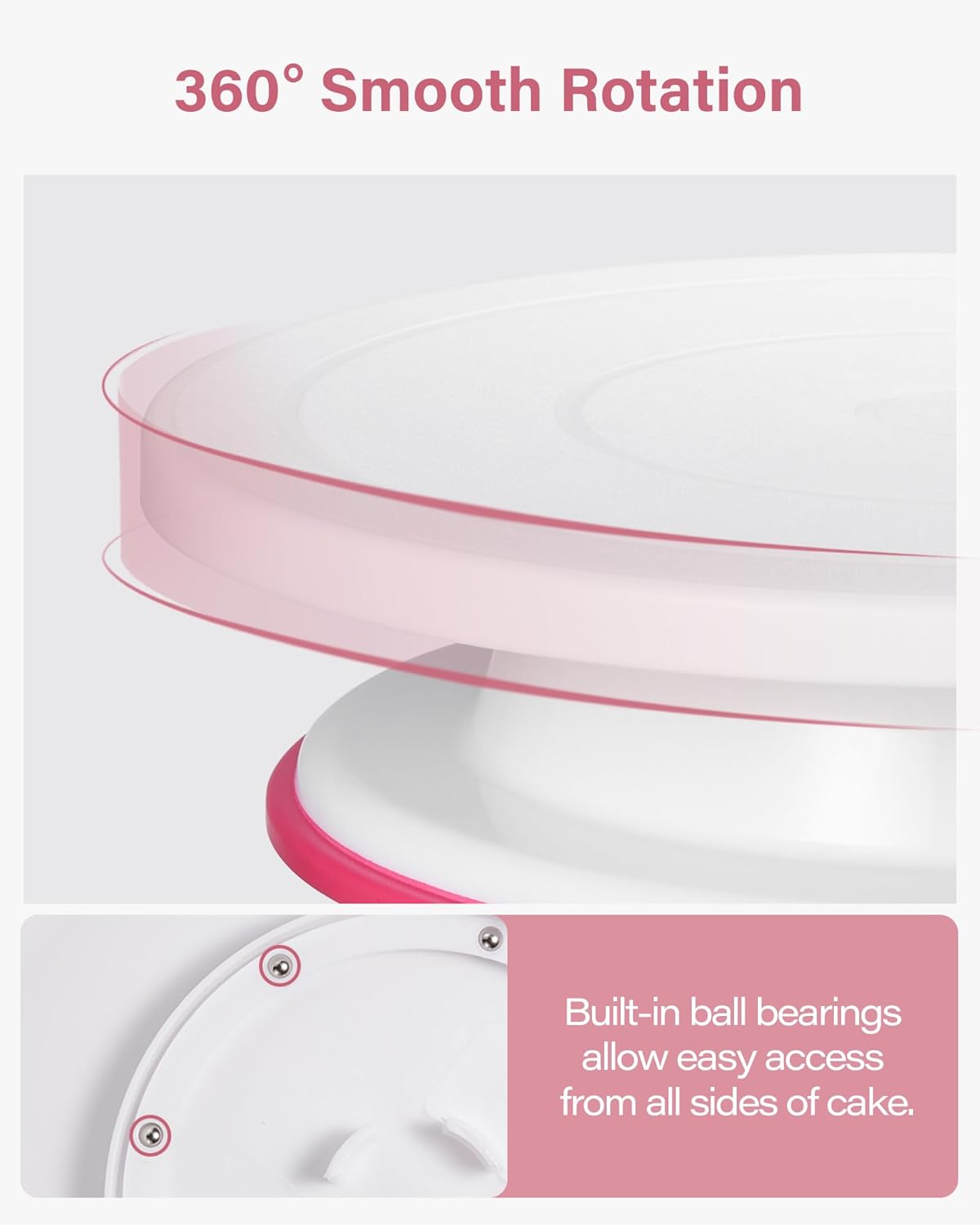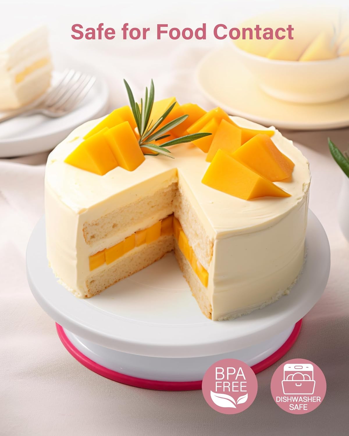 - 360° Rotating Cake Turntable: Made of dishwasher-safe Polypropylene with a non-slip surface, this 11" round turntable is ideal for medium-sized cakes. With a raised cake stand at a comfortable height of 3 inches, it provides convenience and comfort during decoration. The smooth rotation allows for easy frosting piping and smoothing, catering to both left-handed and right-handed decorators. It also has a non-slip surface and base to securely hold the cake in place while rotating.