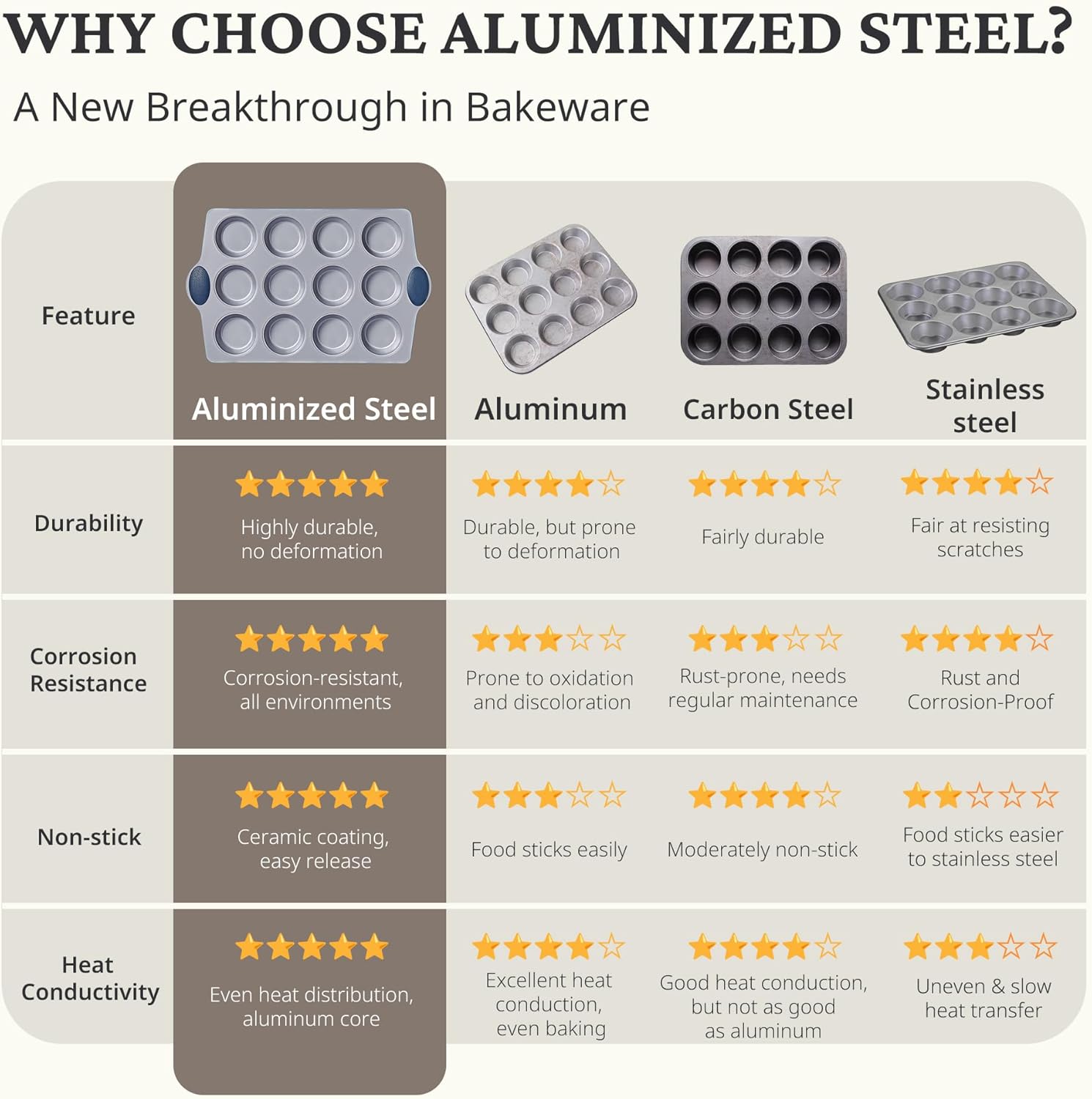 - Heavy-Duty Aluminized Steel: Muffin pan and cupcake pans are made from highly durable aluminized steel, offering 50% better corrosion resistance and durability compared to traditional muffin pans. The even heat distribution significantly shortens baking time and can withstand temperatures up to 500°F. Suitable for use in ovens, dishwashers, refrigerators, and freezers, greatly enhancing convenience.