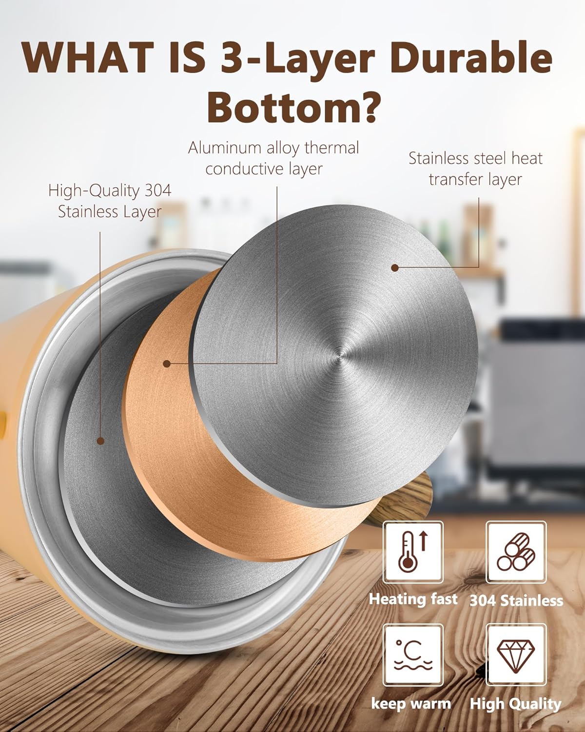 - Three layer base enhances heat retention and durability: Professional grade 18/8 stainless steel construction with triple layer base prevents rust and leaks; Uniform heat circulation ensures rapid boiling on gas, induction or electric stoves; Medium heat setting below 1400W recommended for induction compatibility