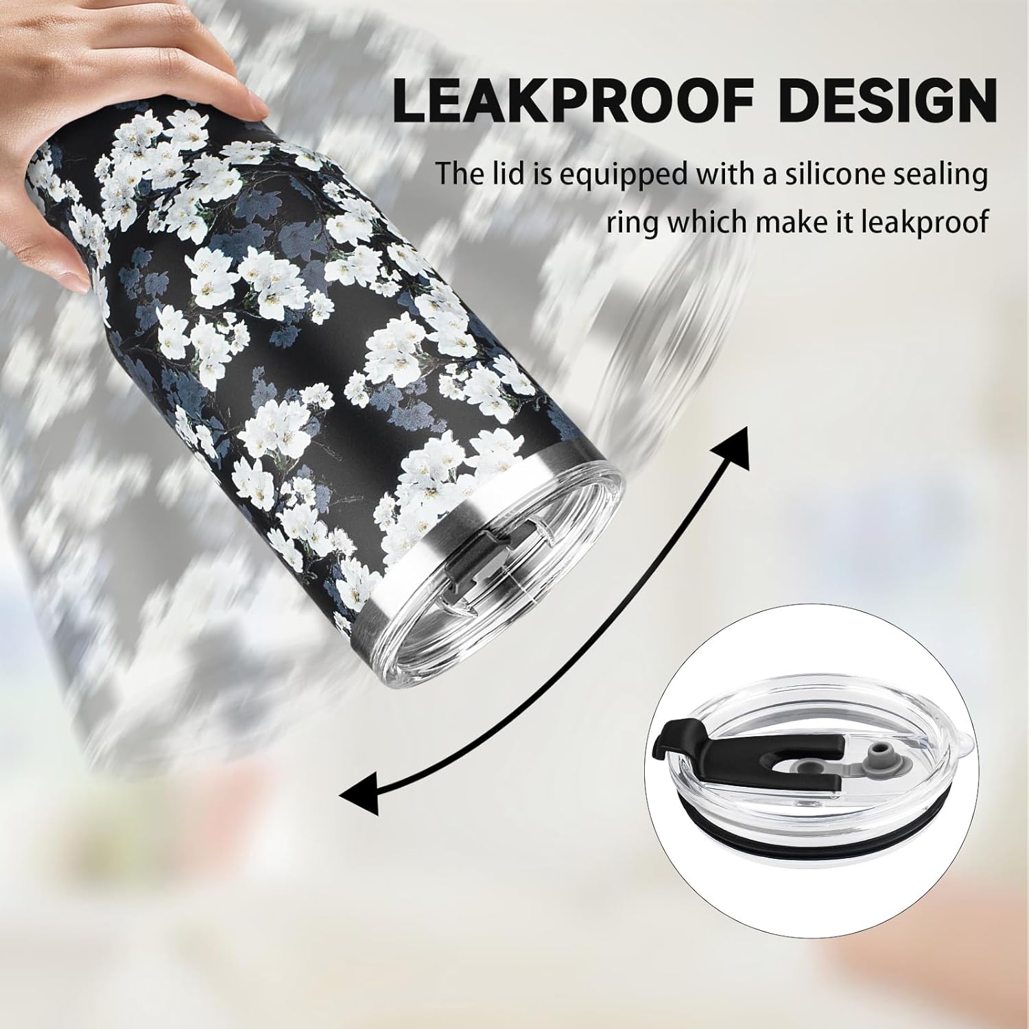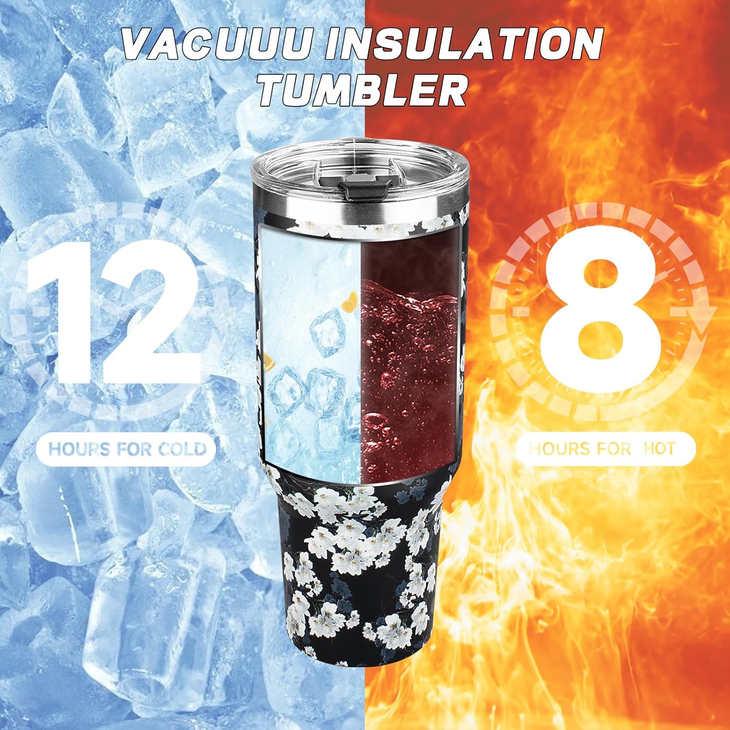 40 oz Tumbler with Lids and Straws, Stainless Steel Insulated Coffee Tumbler, Double Wall Vacuum Insulated Travel Mug Cup, Leakproof Thermal Coffee Cup for Hot and Cold Drinks (White Flower)