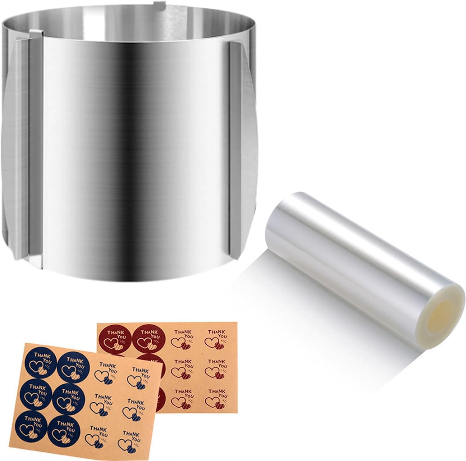 - 【Remarkable Baking Experience】🎂This cake mold and acetate sets including 1 round cake ring mousse mold, 2 delicate stickes(24 pieces), 1 roll of acetate roll(16cm/6.3inch(Width) x 10m/394inch(Length) x 125micron(Thickness)). The clear acetate sheets came in a roll, highly transparent, easy to cut and measure out how long you want, flexible for forming any shape. Great for cake decorating, gift decoration, cake acetate sealing.