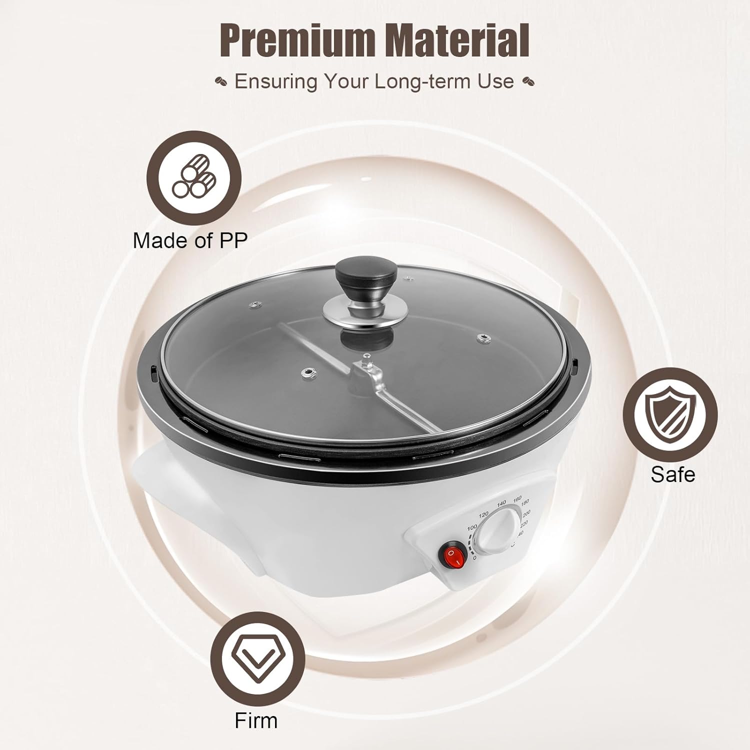 - Compact and Portable: The dimensions of the compact electric roaster are 12.6 x 12.6 x 4.7 inches, with a base diameter of 8.9 inches. Handles on both sides allow you to take the roaster outside or store it in a cabinet